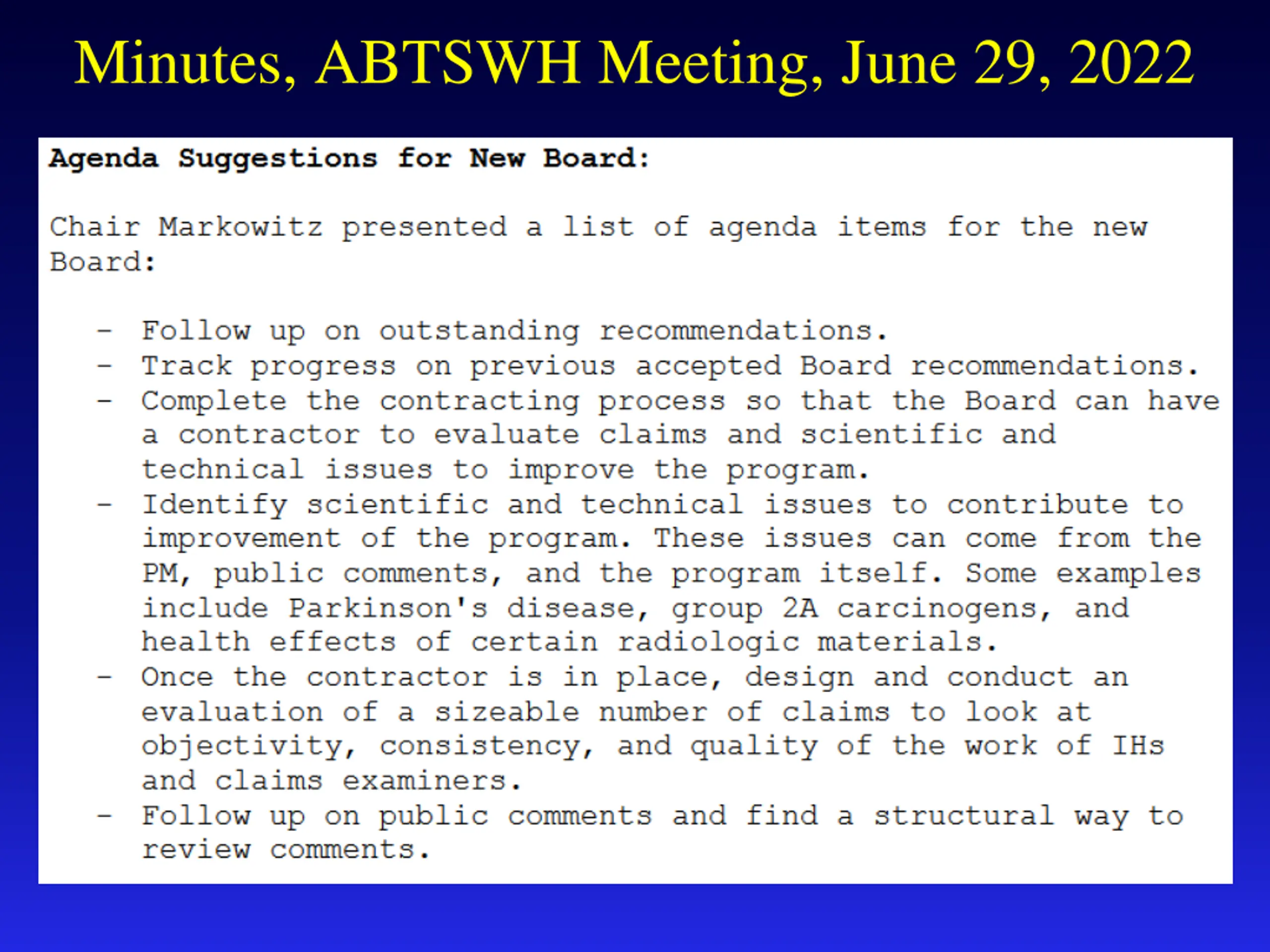 Board Meeting June 29, 2022 Board Feedback on DOL QA Documents: The Board reviewed new or modified qualified assurance procedures developed by DOL EEOICP to evaluate aspects of the work of contract medical physicians (CMC) in developing reports in individual claims. These are not public documents, so the Board cannot discuss them in public. Whether the CMC s issue opinions that represent a faithful and accurate application of current medical literature in addition to the particular facts of the case remains a challenging task, which the Board is designated to address as part of its Charter.