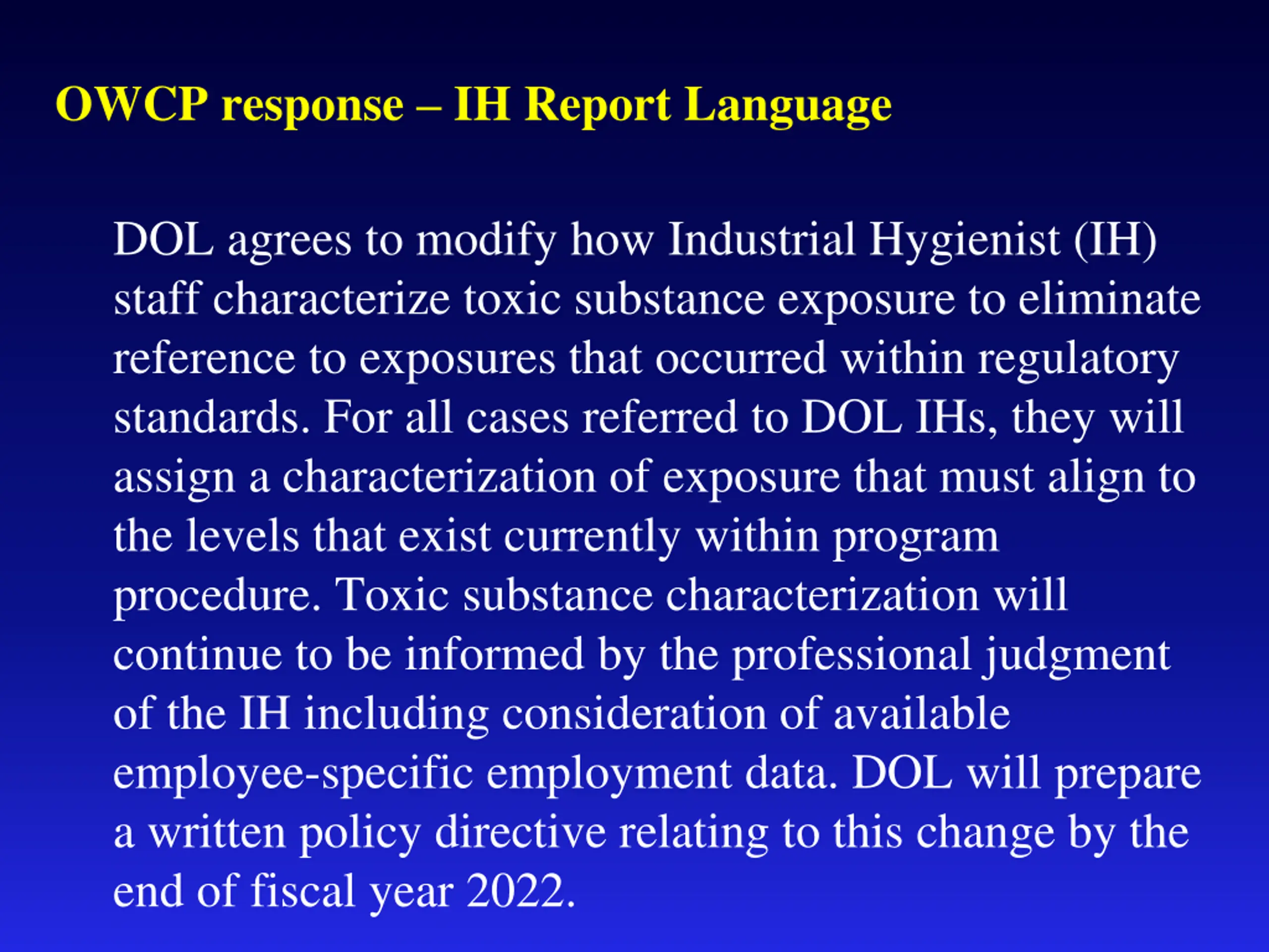 OWCP response IH Report Language DOL agrees to modify how Industrial Hygienist (IH) staff characterize toxic substance exposure to eliminate reference to exposures that occurred within regulatory standards. For all cases referred to DOL IHs, they will assign a characterization of exposure that must align to the levels that exist currently within program procedure. Toxic substance characterization will continue to be informed by the professional judgment of the IH including consideration of available employee-specific employment data. DOL will prepare a written policy directive relating to this change by the end of fiscal year 2022.
