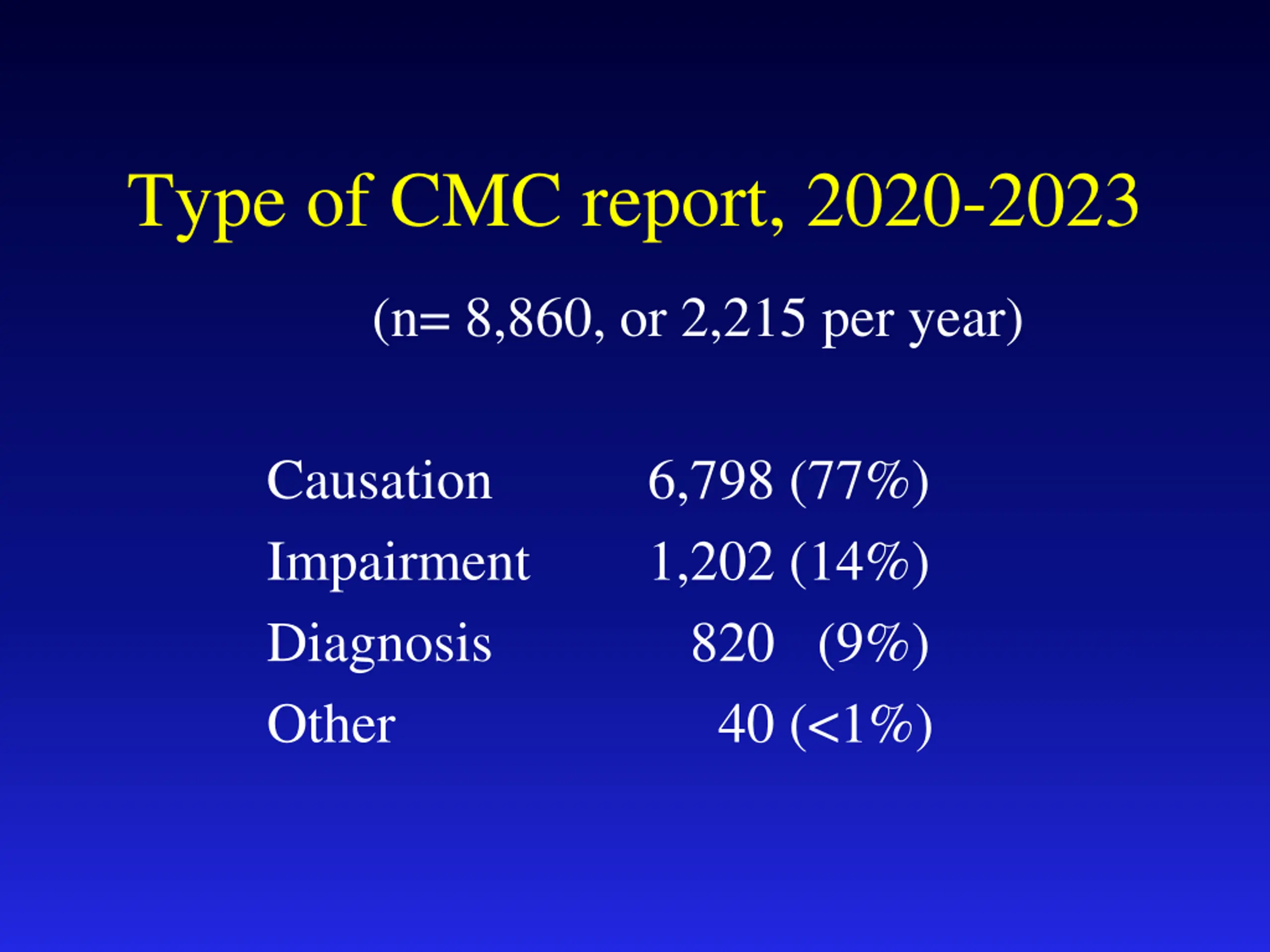 Type of CMC report, 2020-2023 (n= 8,860, or 2,215 per year) Causation Impairment Diagnosis Other 6,798 (77%) 1,202 (14%) 820 (9%) 40 (<1%)