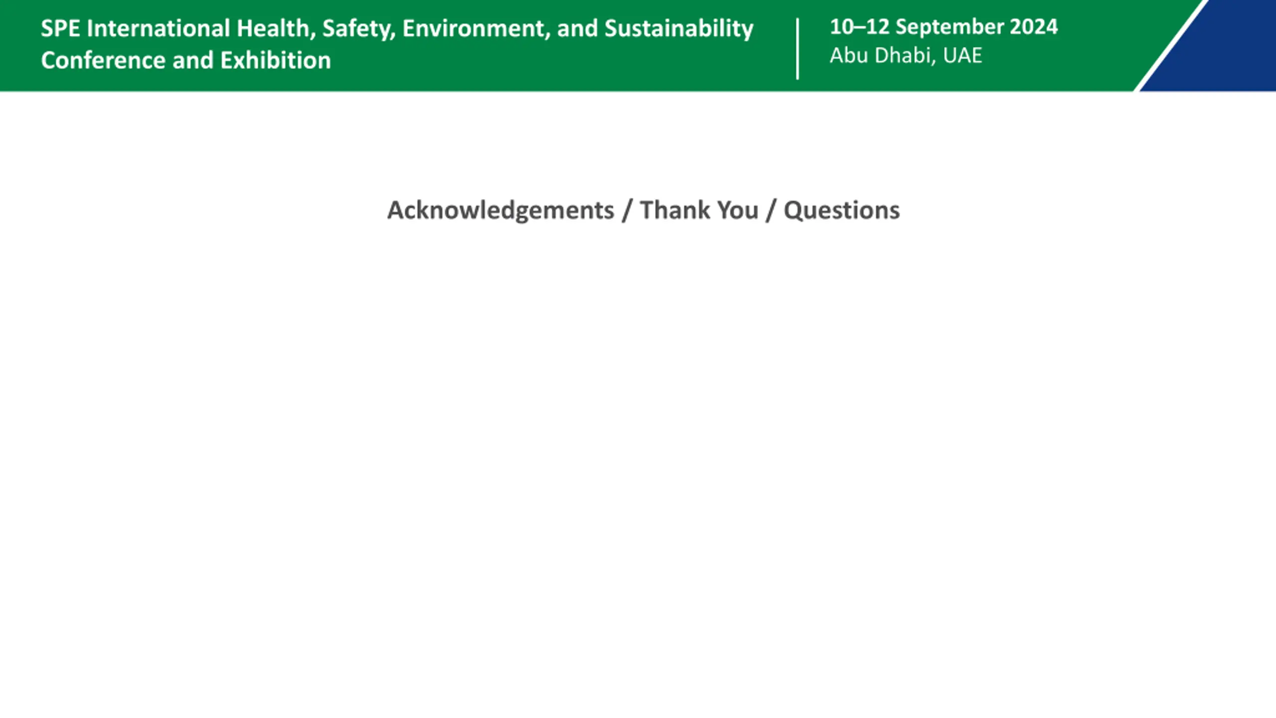 1012 September 2024 Abu Dhabi, UAE SPE International Health, Safety, Environment, and Sustainability Conference and Exhibition Acknowledgements / Thank You / Questions