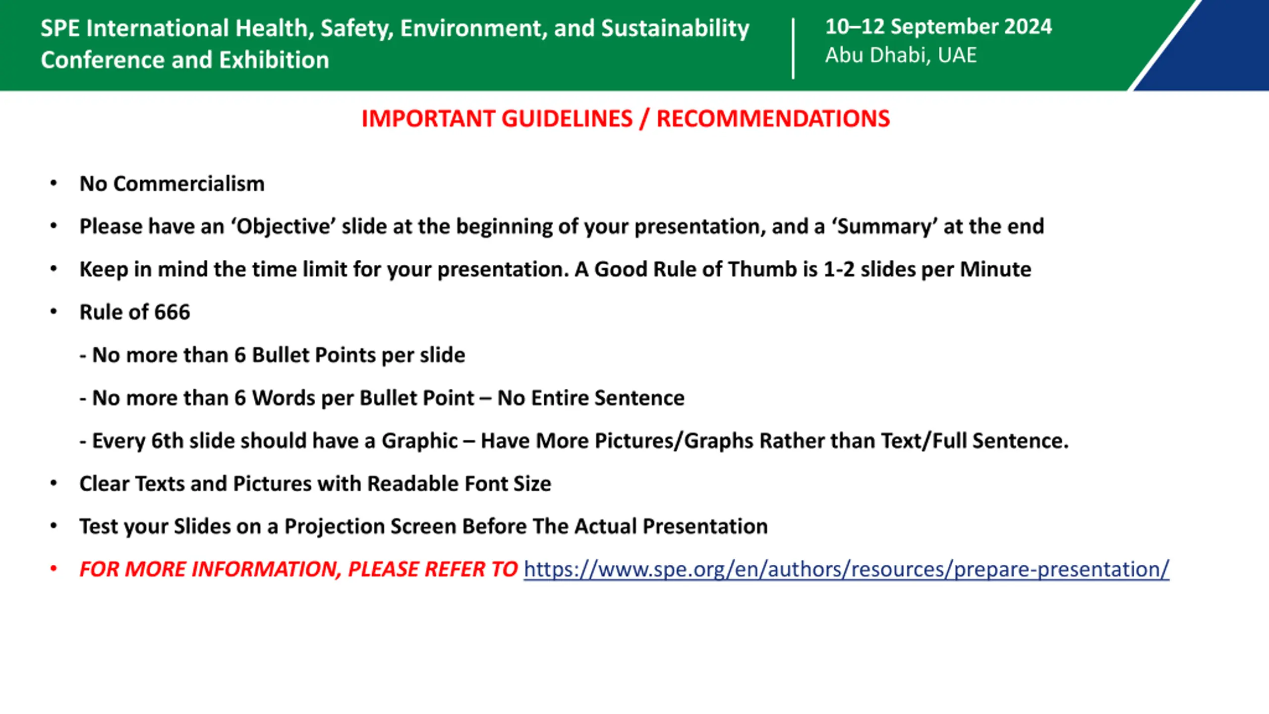 1012 September 2024 Abu Dhabi, UAE SPE International Health, Safety, Environment, and Sustainability Conference and Exhibition IMPORTANT GUIDELINES / RECOMMENDATIONS No Commercialism Please have an Objective slide at the beginning of your presentation, and a Summary at the end Keep in mind the time limit for your presentation. A Good Rule of Thumb is 1-2 slides per Minute Rule of 666 - No more than 6 Bullet Points per slide - No more than 6 Words per Bullet Point No Entire Sentence - Every 6th slide should have a Graphic Have More Pictures/Graphs Rather than Text/Full Sentence. Clear Texts and Pictures with Readable Font Size Test your Slides on a Projection Screen Before The Actual Presentation FOR MORE INFORMATION, PLEASE REFER TO https://www.spe.org/en/authors/resources/prepare-presentation/