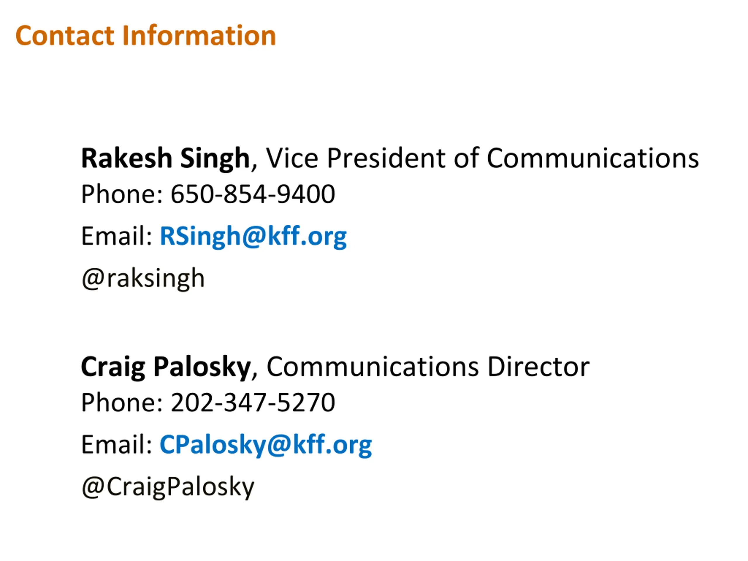 Contact Information Rakesh Singh, Vice President of Communications Phone: 650-854-9400 Email: RSingh@kff.org @raksingh Craig Palosky, Communications Director Phone: 202-347-5270 Email: CPalosky@kff.org @CraigPalosky