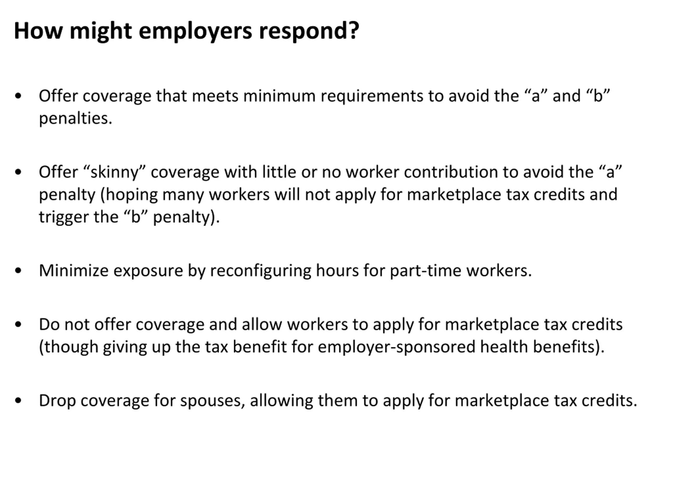 How might employers respond? Offer coverage that meets minimum requirements to avoid the a and b penalties. Offer skinny coverage with little or no worker contribution to avoid the a penalty (hoping many workers will not apply for marketplace tax credits and trigger the b penalty). Minimize exposure by reconfiguring hours for part-time workers. Do not offer coverage and allow workers to apply for marketplace tax credits (though giving up the tax benefit for employer-sponsored health benefits). Drop coverage for spouses, allowing them to apply for marketplace tax credits.