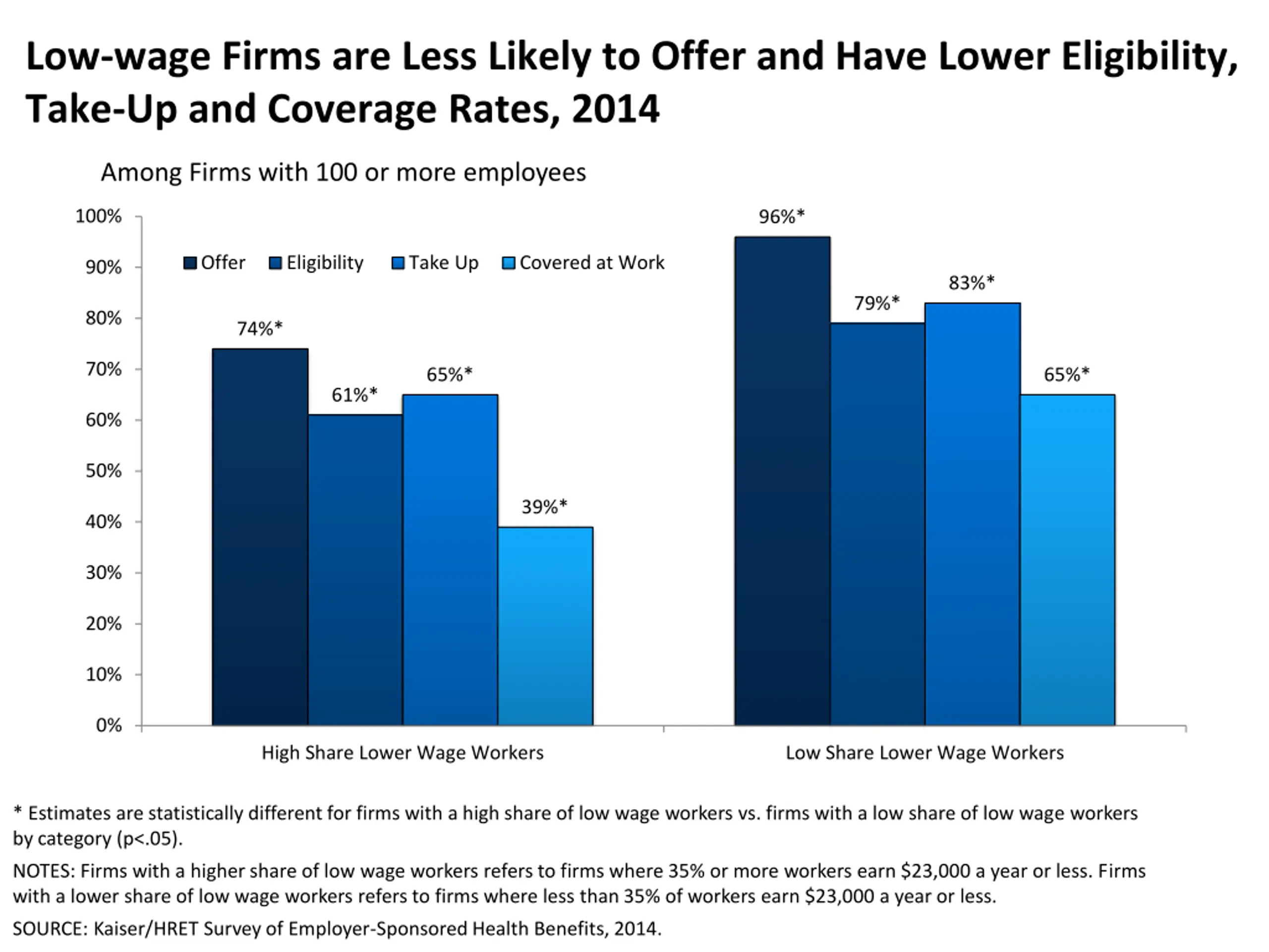 Low-wage Firms are Less Likely to Offer and Have Lower Eligibility, Take-Up and Coverage Rates, 2014 Among Firms with 100 or more employees 100% 96%* Offer Eligibility Take Up Covered at Work 90% 83%* 79%* 80% 74%* 70% 65%* 65%* 61%* 60% 50% 39%* 40% 30% 20% 10% 0% High Share Lower Wage Workers Low Share Lower Wage Workers * Estimates are statistically different for firms with a high share of low wage workers vs. firms with a low share of low wage workers by category (p<.05). NOTES: Firms with a higher share of low wage workers refers to firms where 35% or more workers earn $23,000 a year or less. Firms with a lower share of low wage workers refers to firms where less than 35% of workers earn $23,000 a year or less. SOURCE: Kaiser/HRET Survey of Employer-Sponsored Health Benefits, 2014.