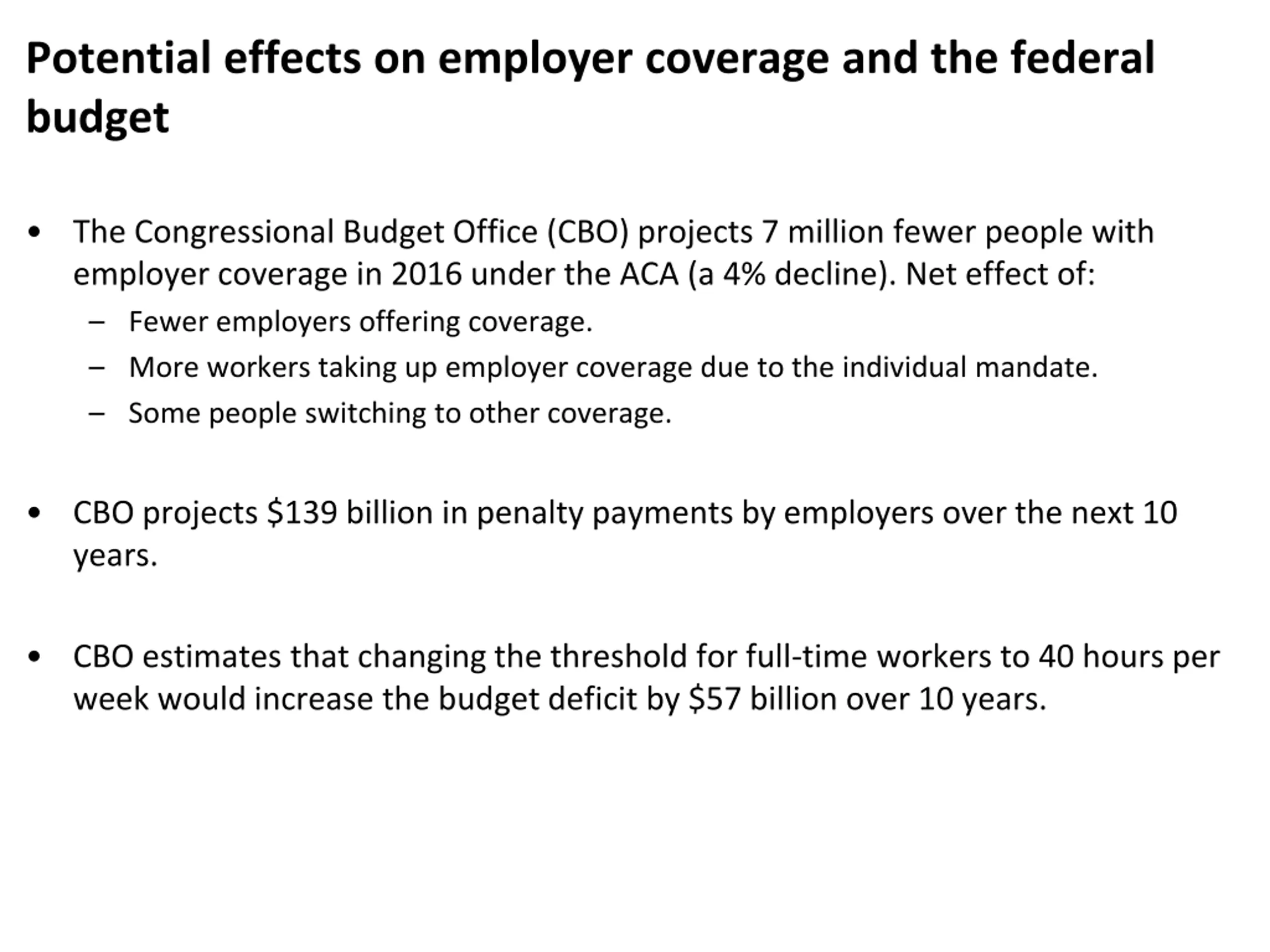 Potential effects on employer coverage and the federal budget The Congressional Budget Office (CBO) projects 7 million fewer people with employer coverage in 2016 under the ACA (a 4% decline). Net effect of: Fewer employers offering coverage. More workers taking up employer coverage due to the individual mandate. Some people switching to other coverage. CBO projects $139 billion in penalty payments by employers over the next 10 years. CBO estimates that changing the threshold for full-time workers to 40 hours per week would increase the budget deficit by $57 billion over 10 years.