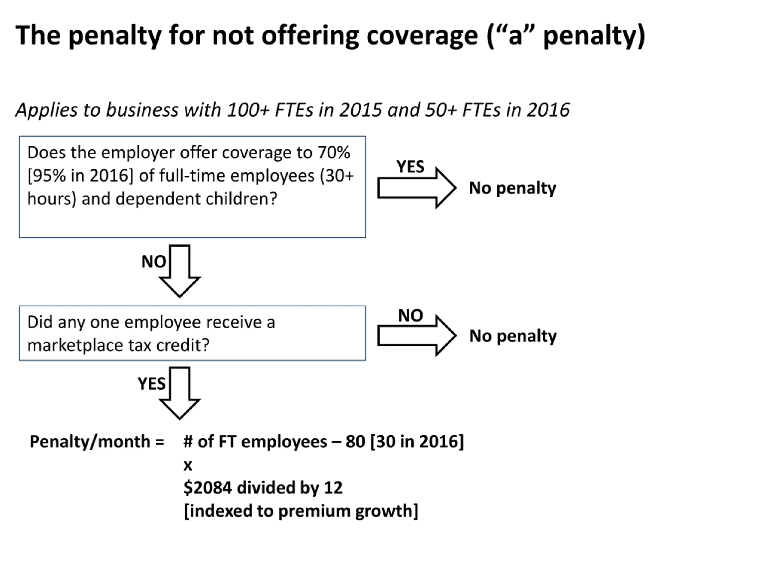 The penalty for not offering coverage (a penalty) Applies to business with 100+ FTEs in 2015 and 50+ FTEs in 2016 Does the employer offer coverage to 70% [95% in 2016] of full-time employees (30+ hours) and dependent children? YES No penalty NO NO Did any one employee receive a marketplace tax credit? No penalty YES Penalty/month = # of FT employees 80 [30 in 2016] x $2084 divided by 12 [indexed to premium growth]