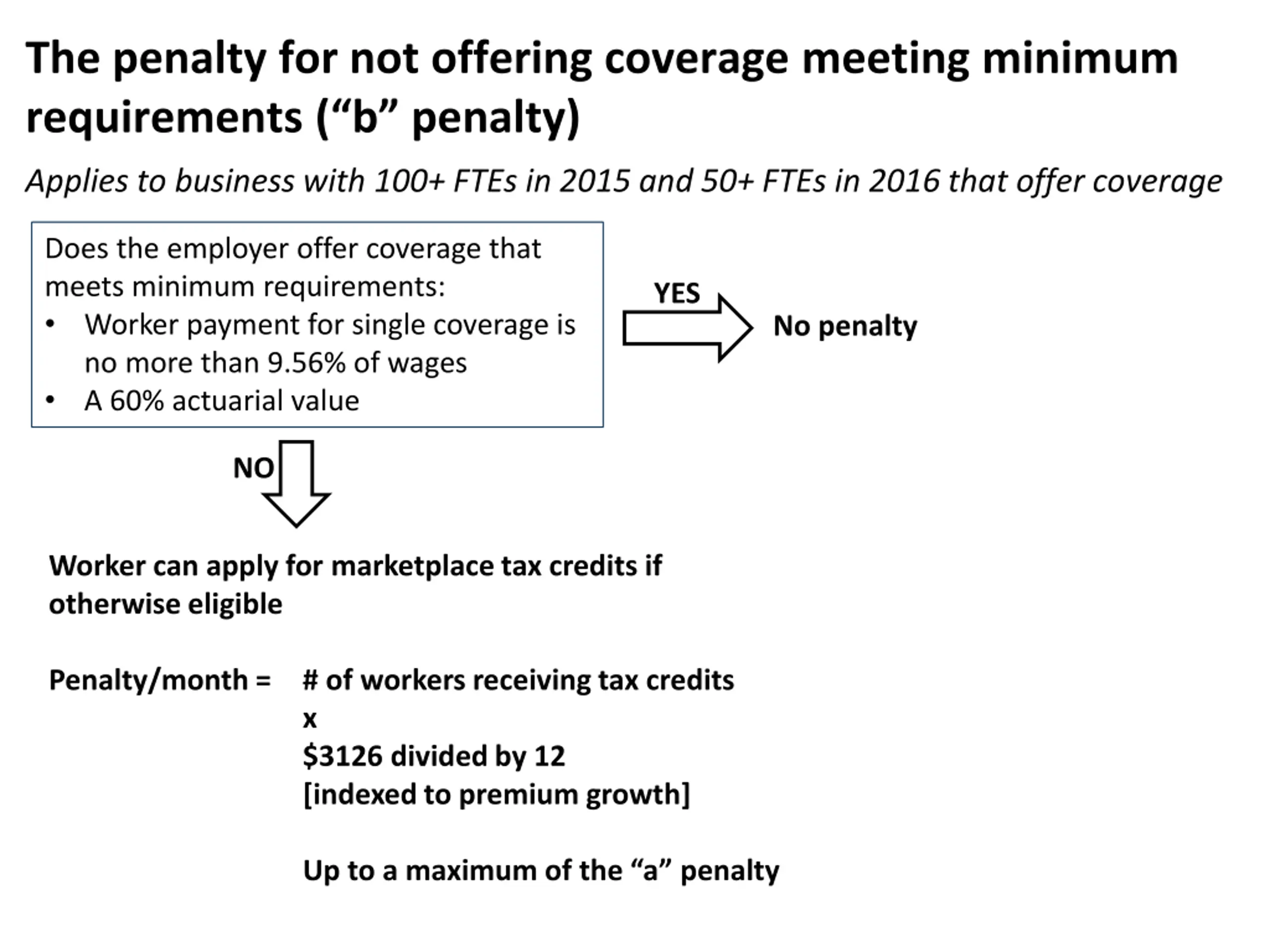The penalty for not offering coverage meeting minimum requirements ( b penalty) Applies to business with 100+ FTEs in 2015 and 50+ FTEs in 2016 that offer coverage Does the employer offer coverage that meets minimum requirements: Worker payment for single coverage is no more than 9.56% of wages A 60% actuarial value YES No penalty NO Worker can apply for marketplace tax credits if otherwise eligible Penalty/month = # of workers receiving tax credits x $3126 divided by 12 [indexed to premium growth] Up to a maximum of the a penalty