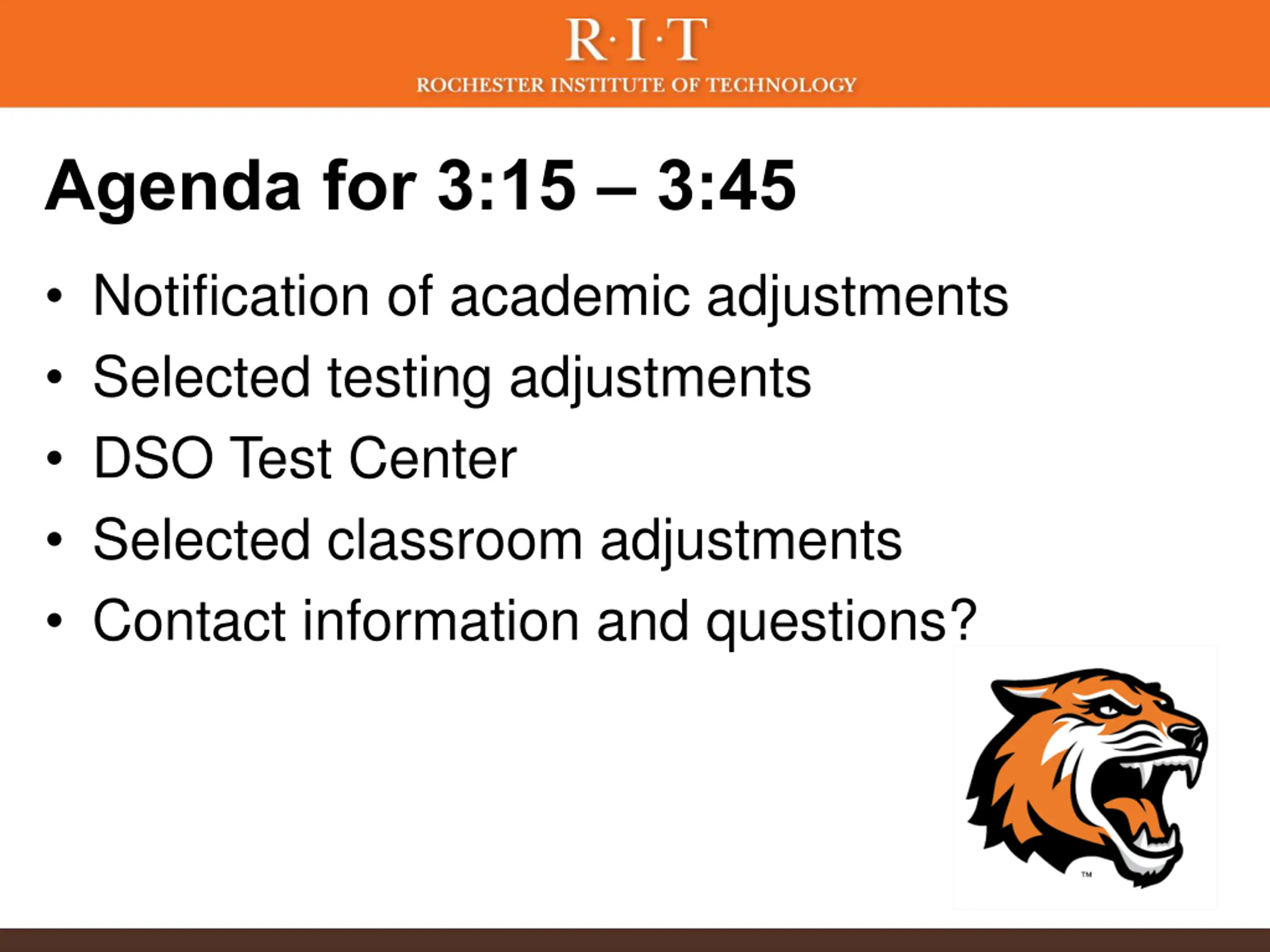 Agenda for 3:15 3:45 Notification of academic adjustments Selected testing adjustments DSO Test Center Selected classroom adjustments Contact information and questions?