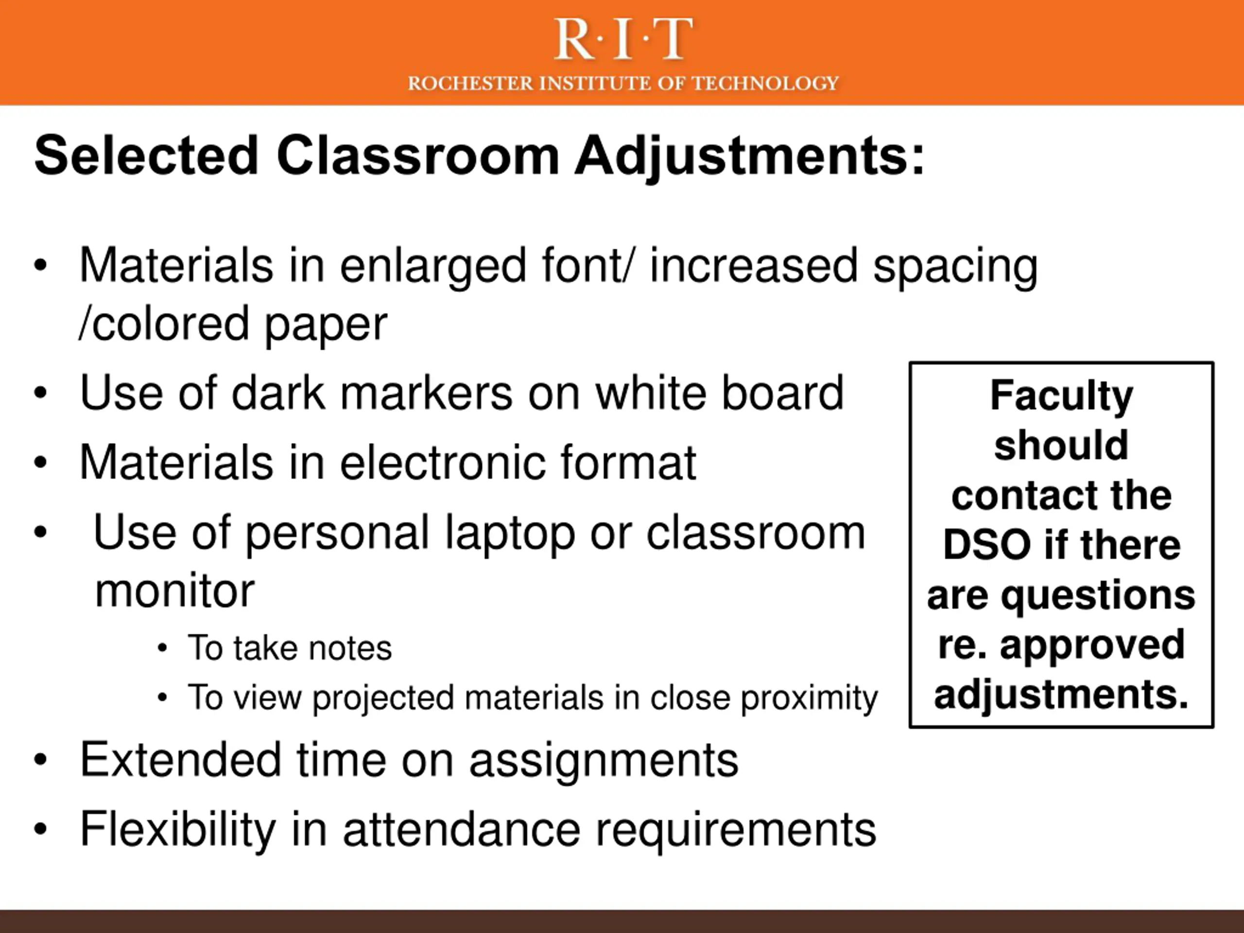 Selected Classroom Adjustments: Materials in enlarged font/ increased spacing /colored paper Use of dark markers on white board Materials in electronic format Use of personal laptop or classroom monitor To take notes To view projected materials in close proximity Extended time on assignments Flexibility in attendance requirements Faculty should contact the DSO if there are questions re. approved adjustments.