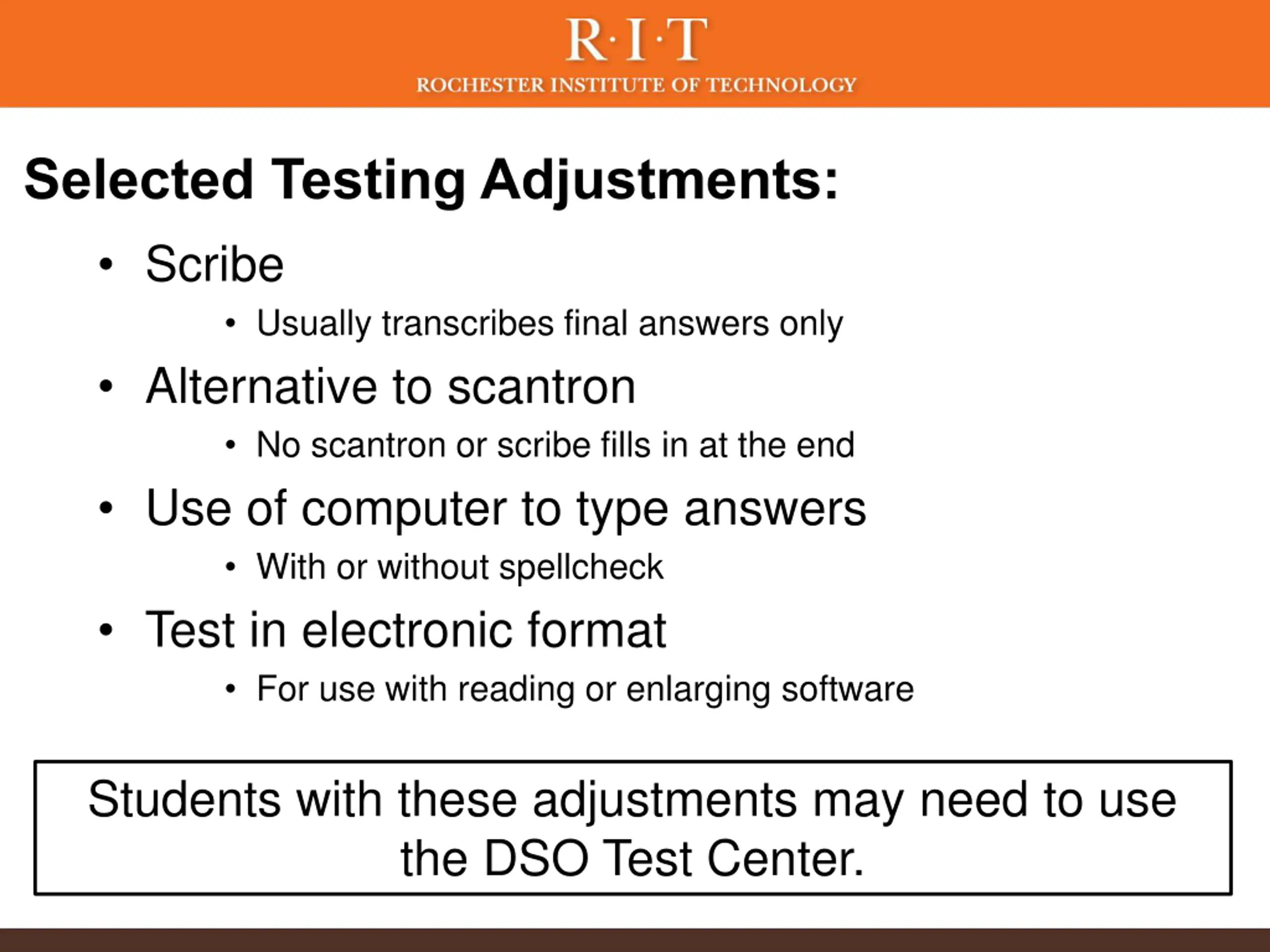 Selected Testing Adjustments: Scribe Usually transcribes final answers only Alternative to scantron No scantron or scribe fills in at the end Use of computer to type answers With or without spellcheck Test in electronic format For use with reading or enlarging software Students with these adjustments may need to use the DSO Test Center.
