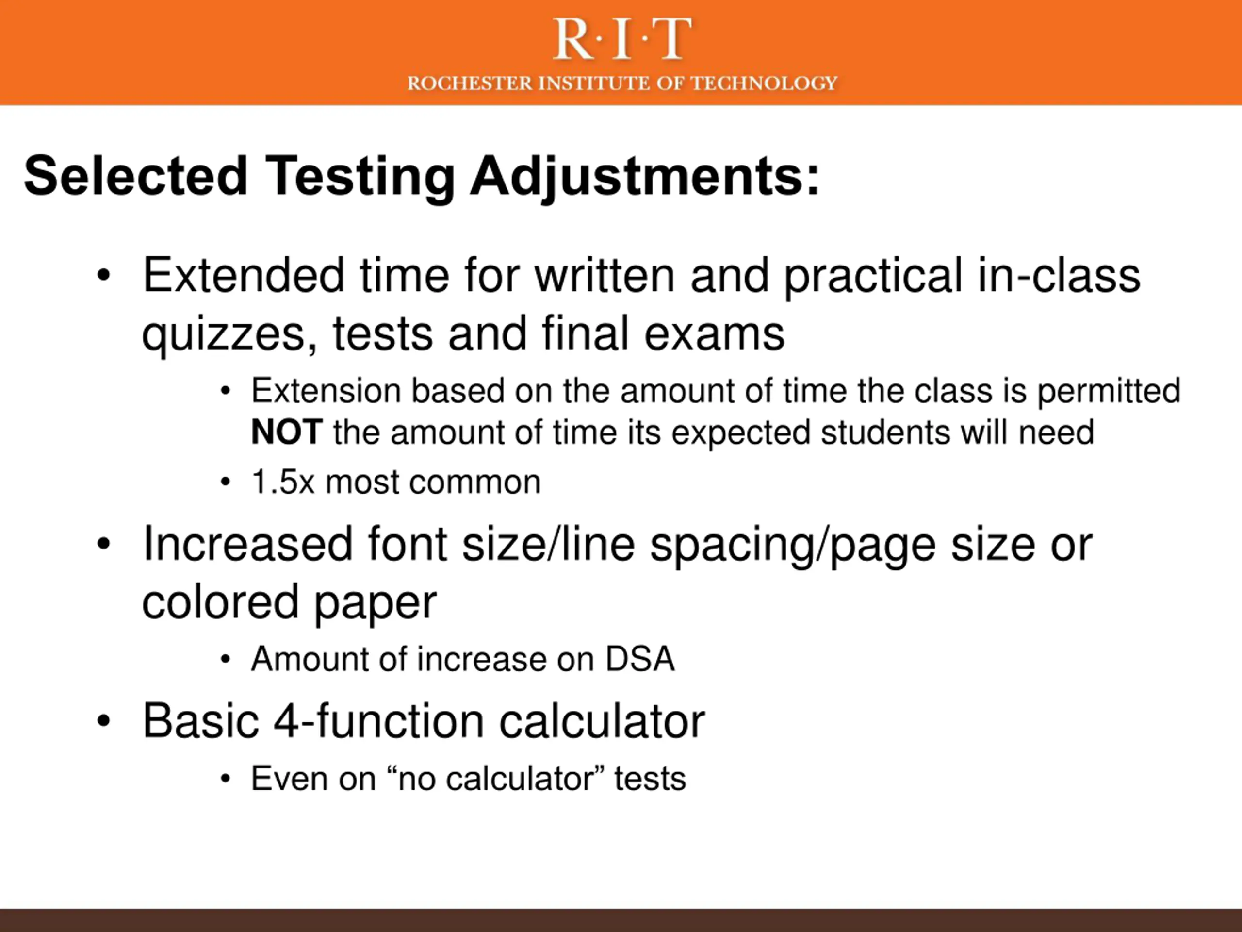 Selected Testing Adjustments: Extended time for written and practical in-class quizzes, tests and final exams Extension based on the amount of time the class is permitted NOT the amount of time its expected students will need 1.5x most common Increased font size/line spacing/page size or colored paper Amount of increase on DSA Basic 4-function calculator Even on no calculator tests