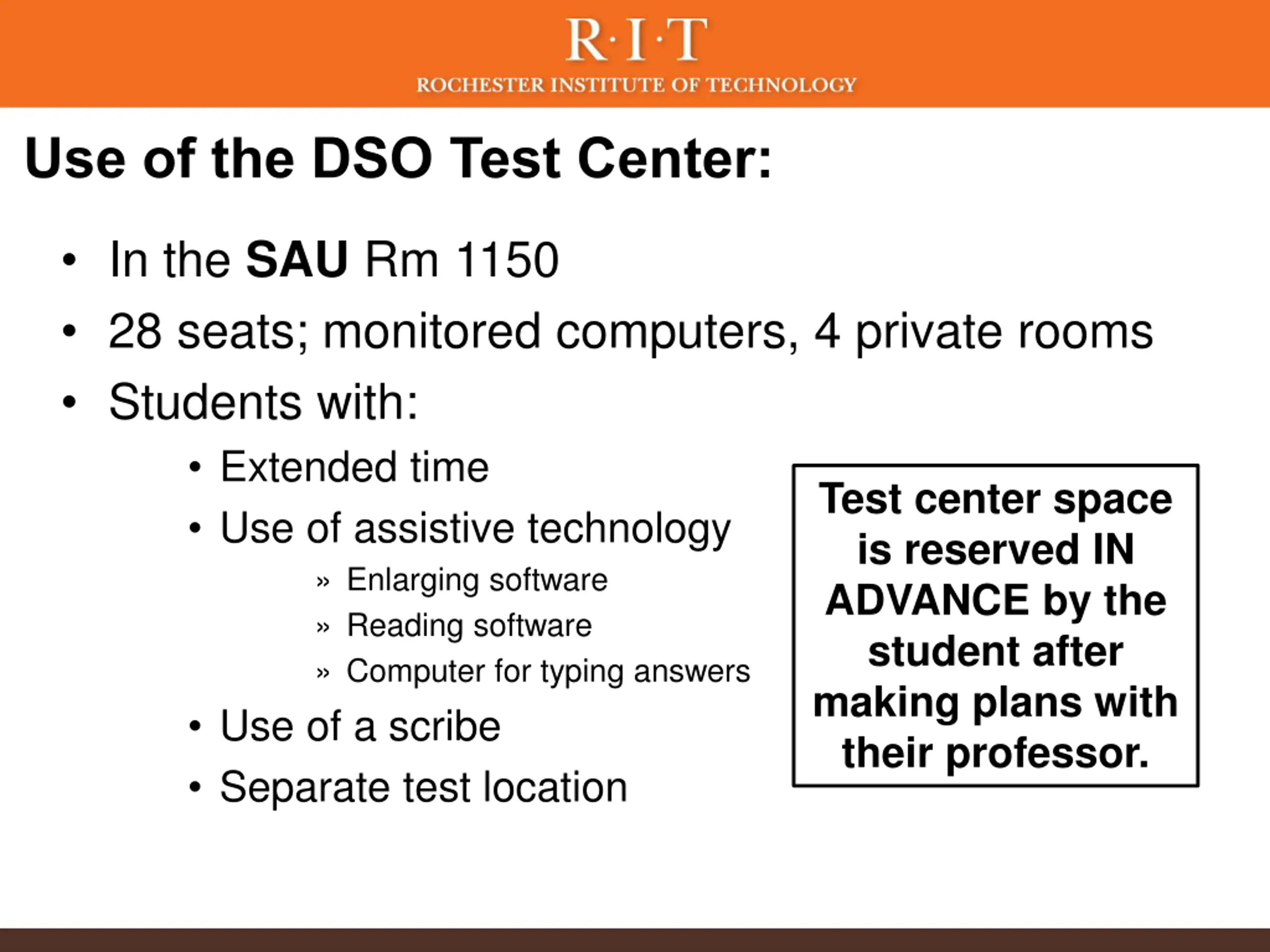 Use of the DSO Test Center: In the SAU Rm 1150 28 seats; monitored computers, 4 private rooms Students with: Extended time Use of assistive technology Enlarging software Reading software Computer for typing answers Use of a scribe Separate test location Test center space is reserved IN ADVANCE by the student after making plans with their professor.
