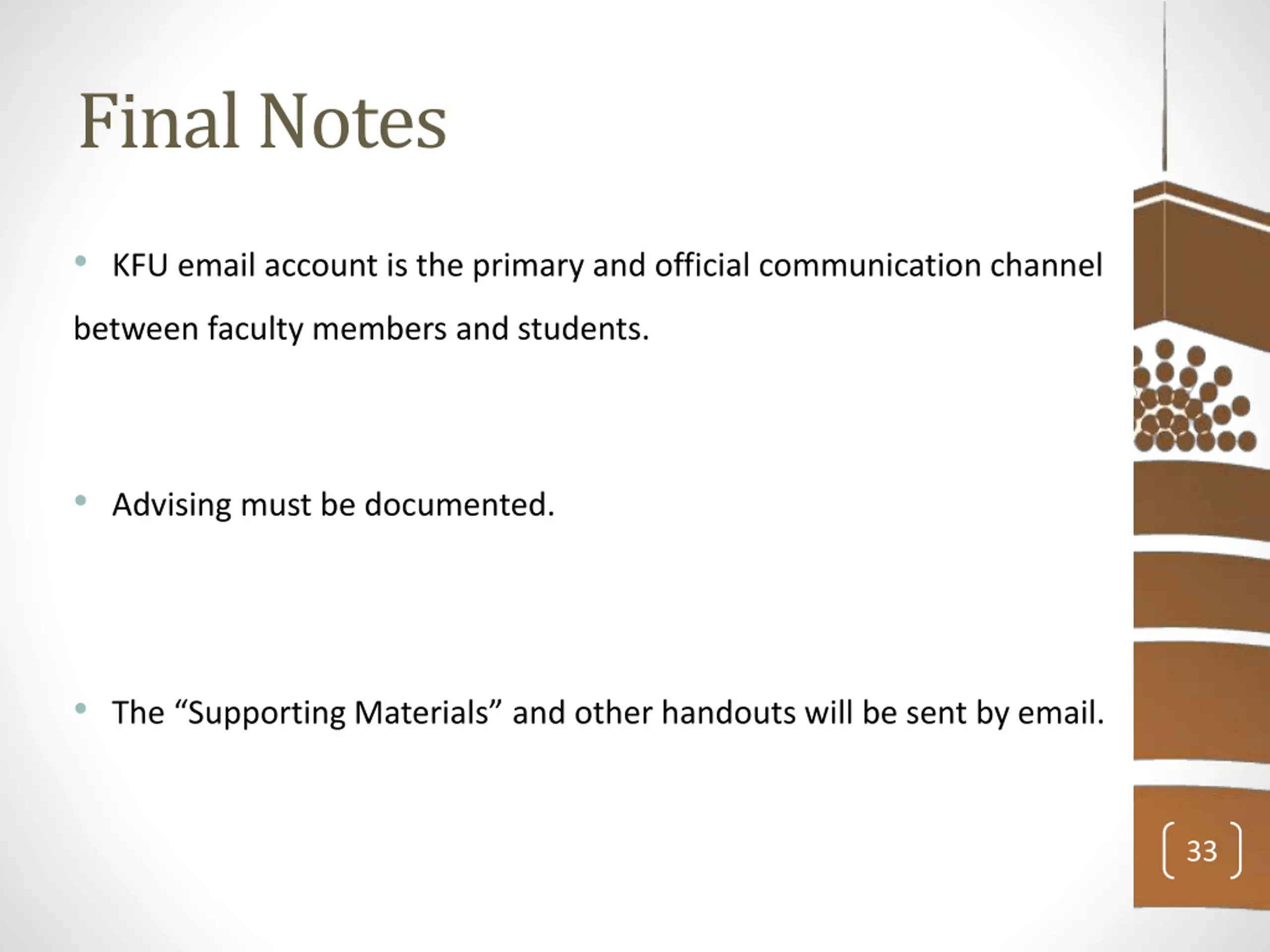 Final Notes KFU email account is the primary and official communication channel between faculty members and students. Advising must be documented. The Supporting Materials and other handouts will be sent by email. 33