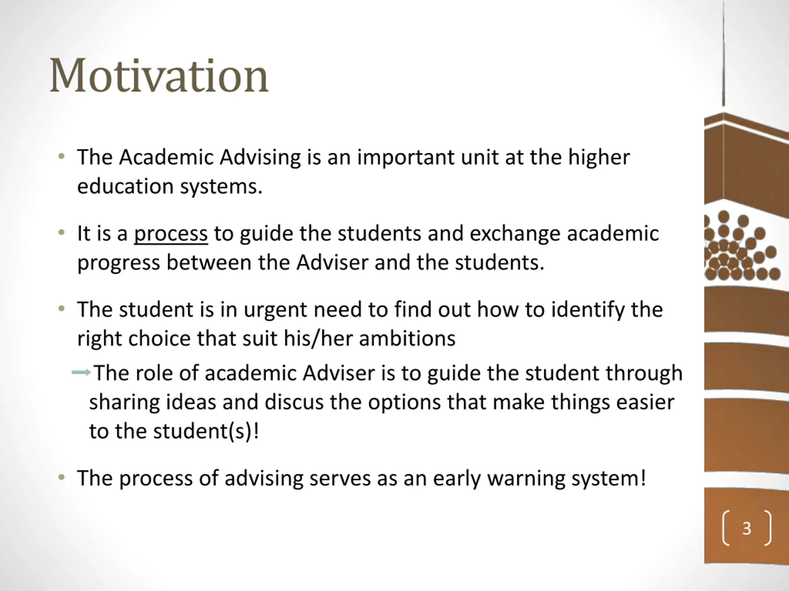 Motivation The Academic Advising is an important unit at the higher education systems. It is a process to guide the students and exchange academic progress between the Adviser and the students. The student is in urgent need to find out how to identify the right choice that suit his/her ambitions The role of academic Adviser is to guide the student through sharing ideas and discus the options that make things easier to the student(s)! The process of advising serves as an early warning system! 3