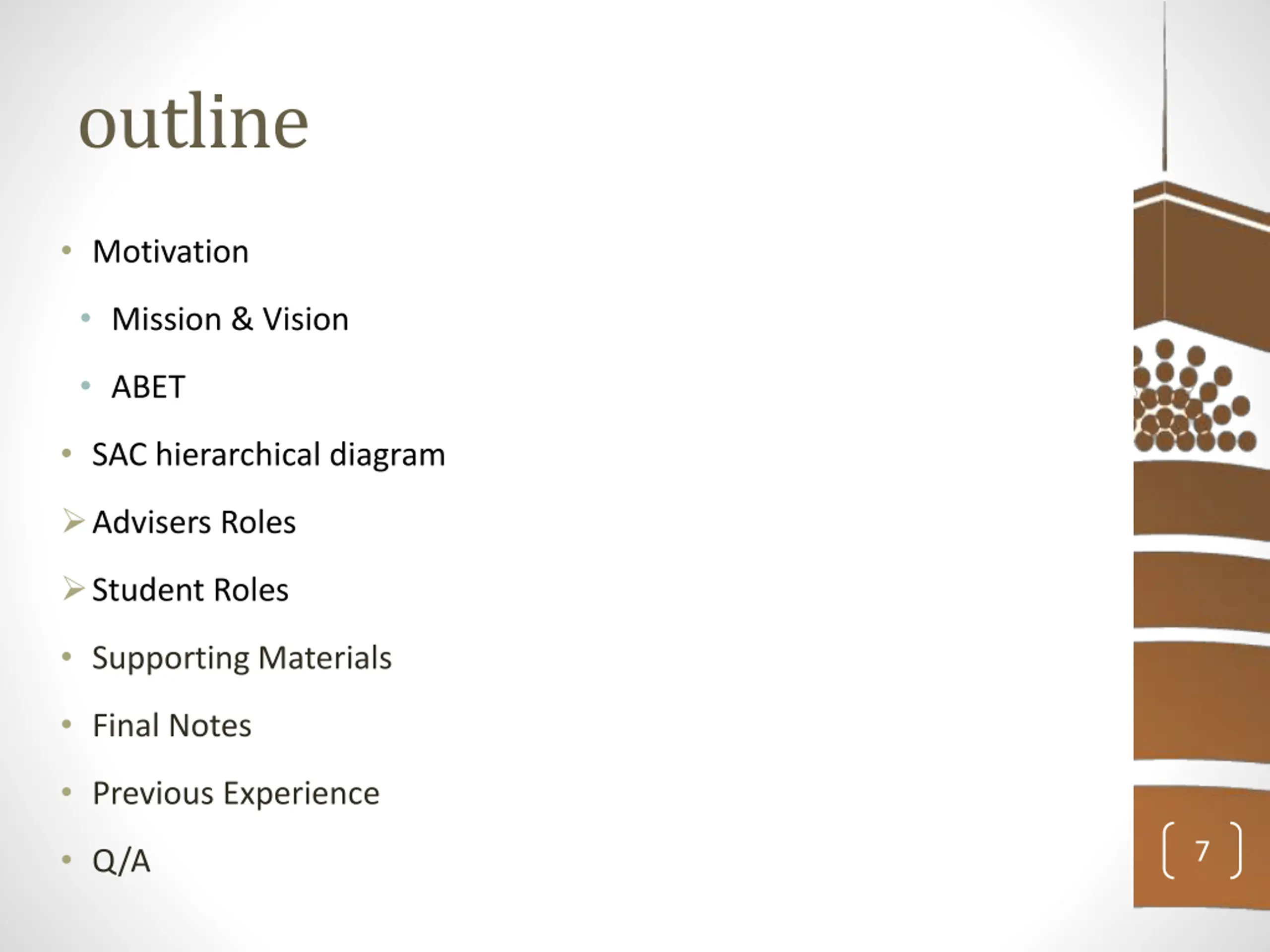 outline Motivation Mission & Vision ABET SAC hierarchical diagram Advisers Roles Student Roles Supporting Materials Final Notes Previous Experience 7 Q/A