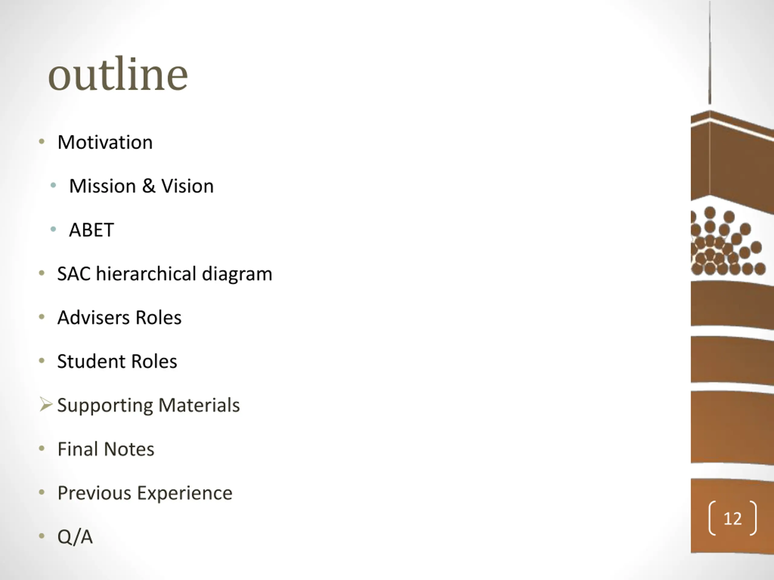 outline Motivation Mission & Vision ABET SAC hierarchical diagram Advisers Roles Student Roles Supporting Materials Final Notes Previous Experience 12 Q/A