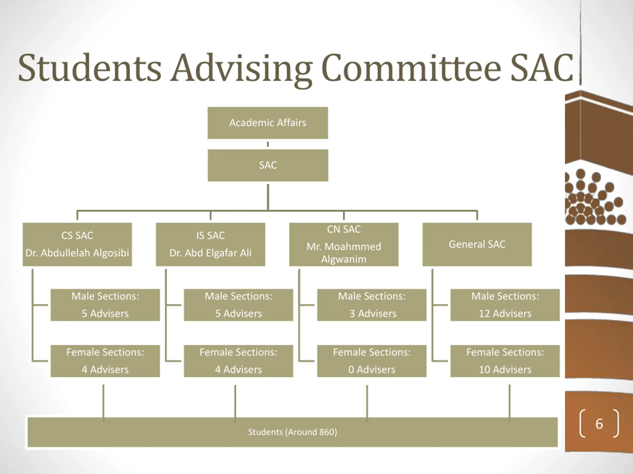 Students Advising Committee SAC Academic Affairs SAC CN SAC CS SAC IS SAC General SAC Mr. Moahmmed Algwanim Dr. Abdullelah Algosibi Dr. Abd Elgafar Ali Male Sections: Male Sections: Male Sections: Male Sections: 5 Advisers 5 Advisers 3 Advisers 12 Advisers Female Sections: Female Sections: Female Sections: Female Sections: 4 Advisers 4 Advisers 0 Advisers 10 Advisers 6 Students (Around 860)