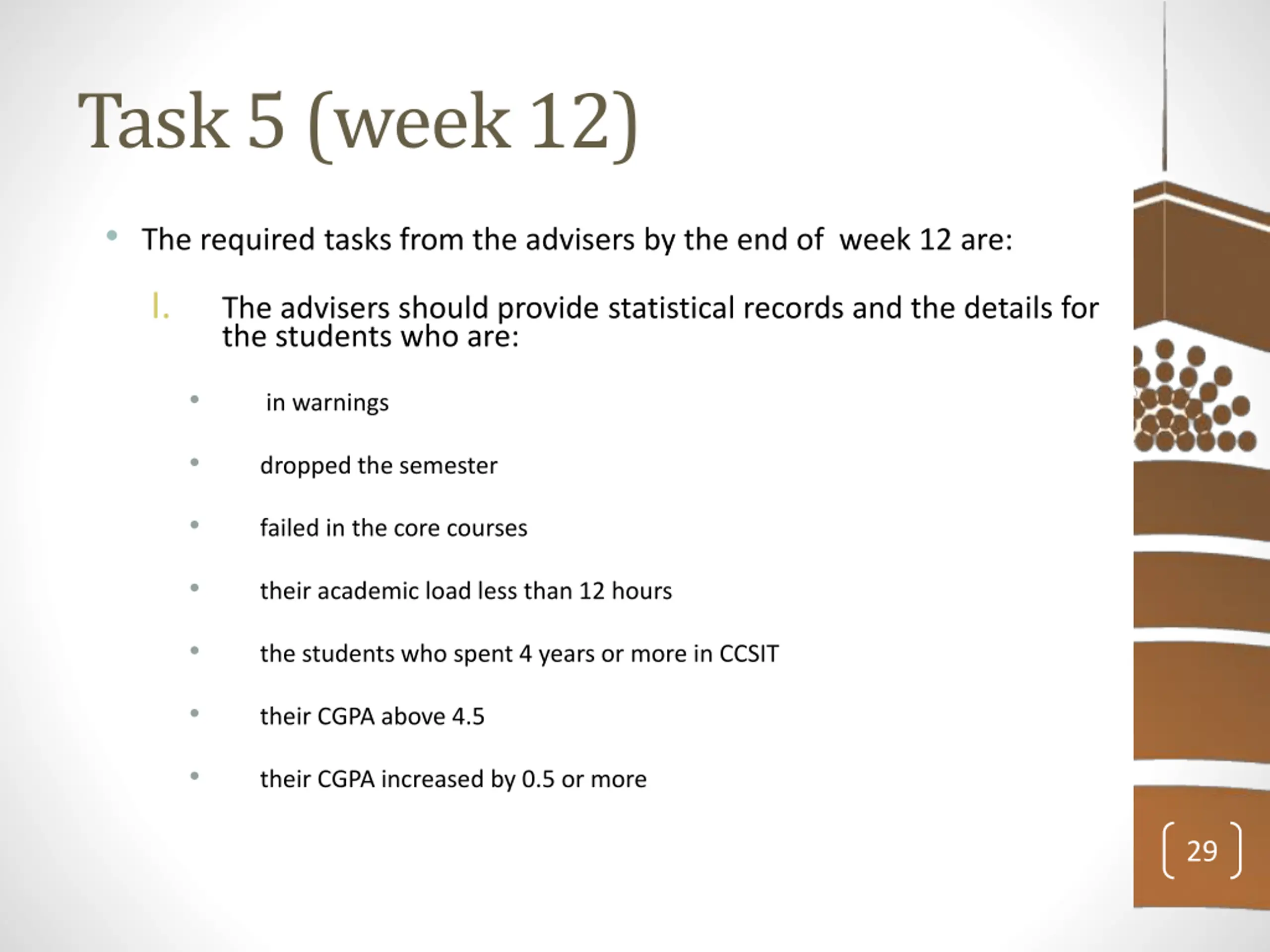 Task 5 (week 12) The required tasks from the advisers by the end of week 12 are: I. The advisers should provide statistical records and the details for the students who are: in warnings dropped the semester failed in the core courses their academic load less than 12 hours the students who spent 4 years or more in CCSIT their CGPA above 4.5 their CGPA increased by 0.5 or more 29
