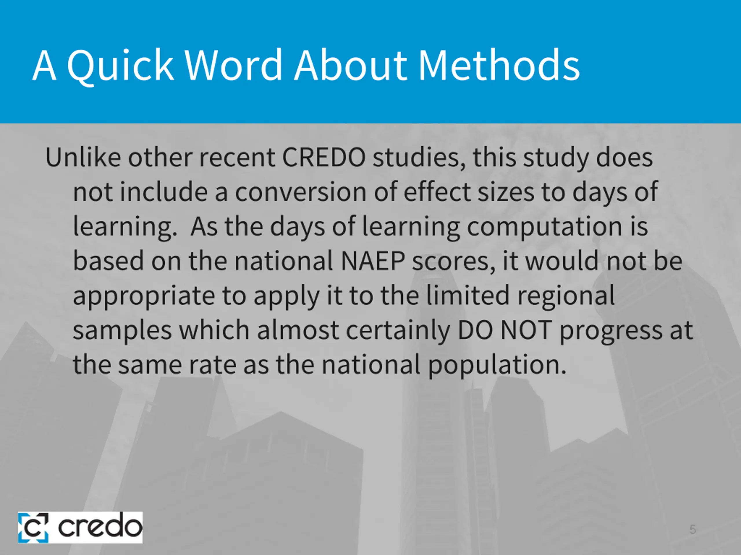 A Quick Word About Methods Unlike other recent CREDO studies, this study does not include a conversion of effect sizes to days of learning. As the days of learning computation is based on the national NAEP scores, it would not be appropriate to apply it to the limited regional samples which almost certainly DO NOT progress at the same rate as the national population. 5