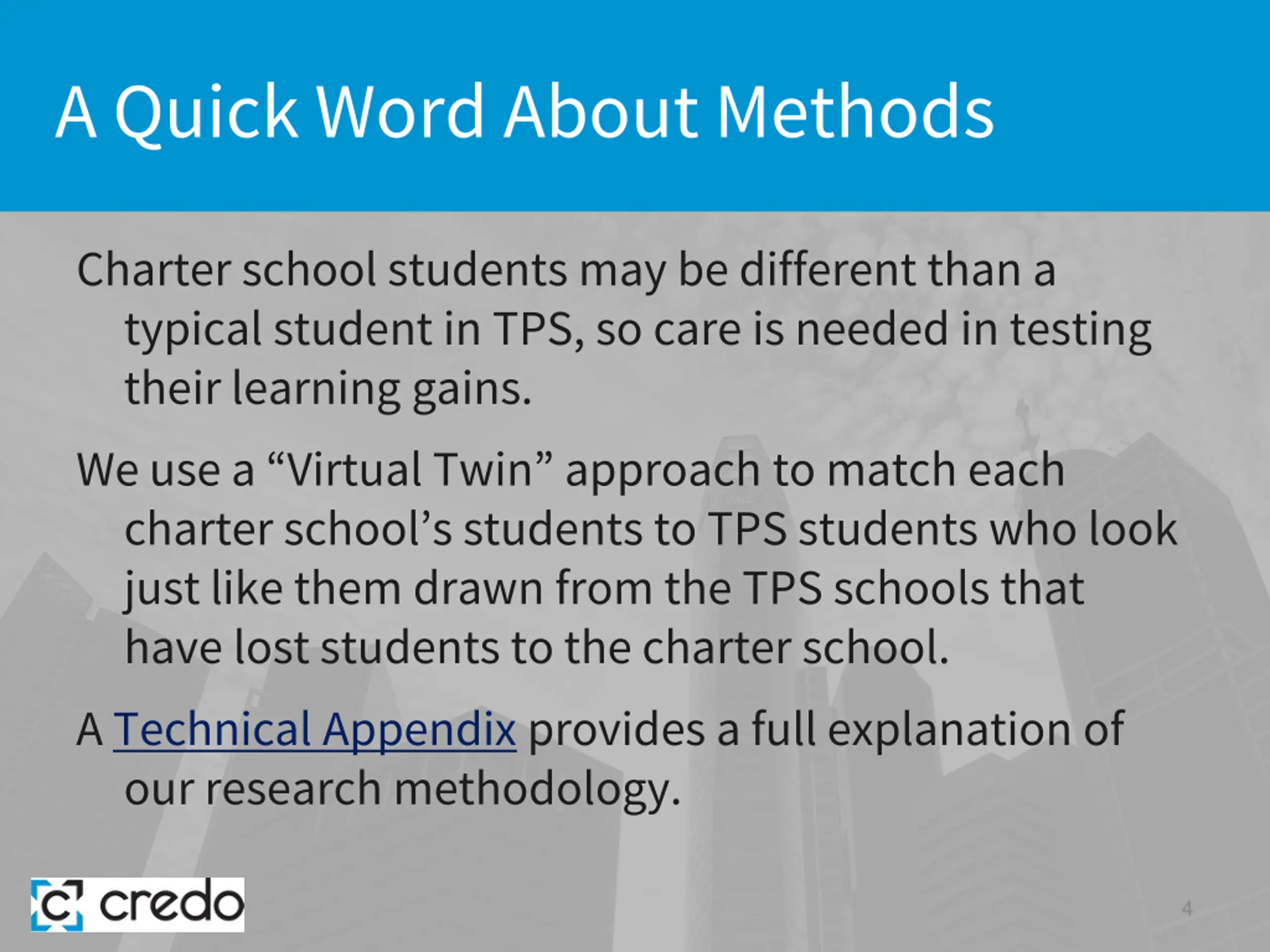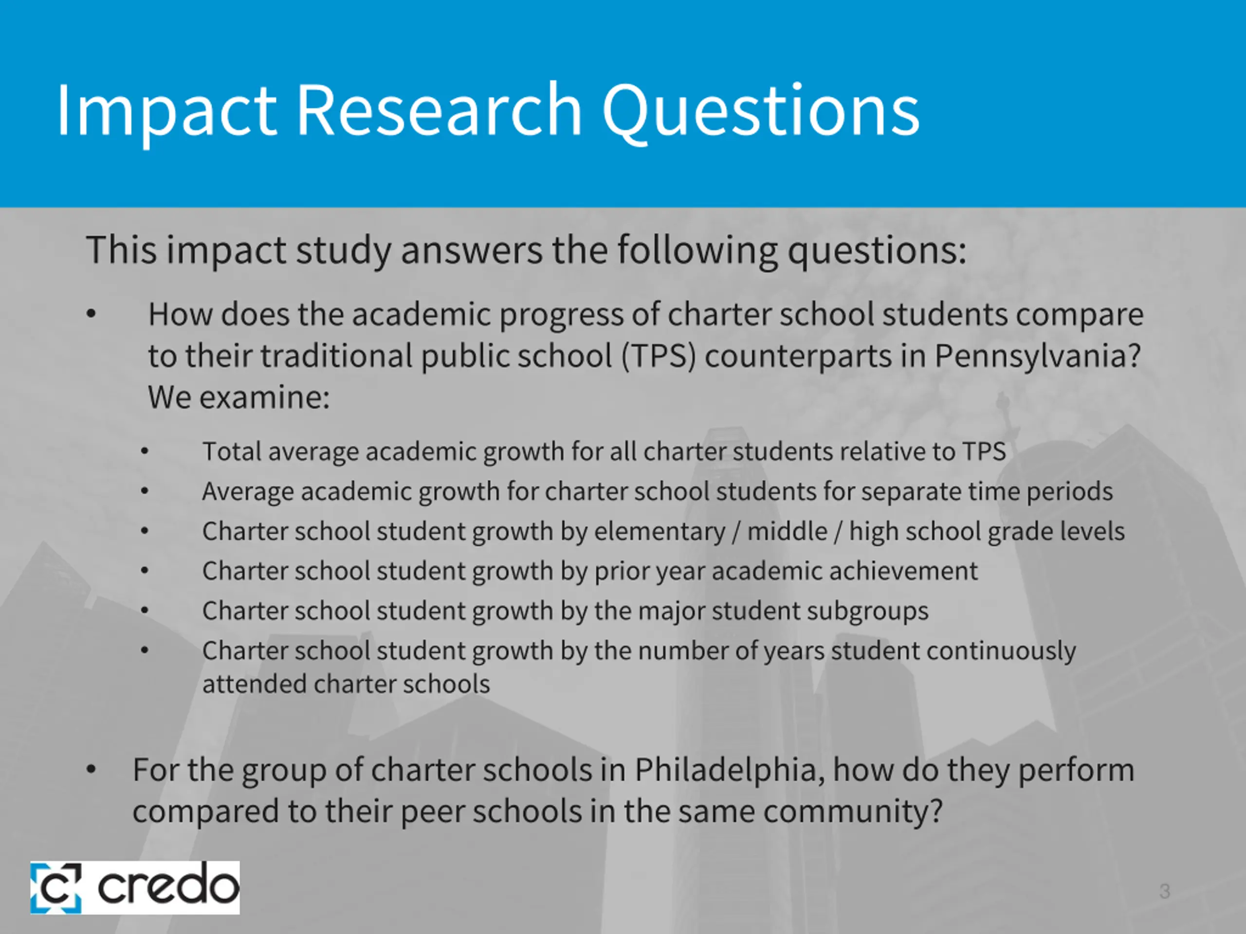 Impact Research Questions This impact study answers the following questions: How does the academic progress of charter school students compare to their traditional public school (TPS) counterparts in Pennsylvania? We examine: Total average academic growth for all charter students relative to TPS Average academic growth for charter school students for separate time periods Charter school student growth by elementary / middle / high school grade levels Charter school student growth by prior year academic achievement Charter school student growth by the major student subgroups Charter school student growth by the number of years student continuously attended charter schools For the group of charter schools in Philadelphia, how do they perform compared to their peer schools in the same community? 3