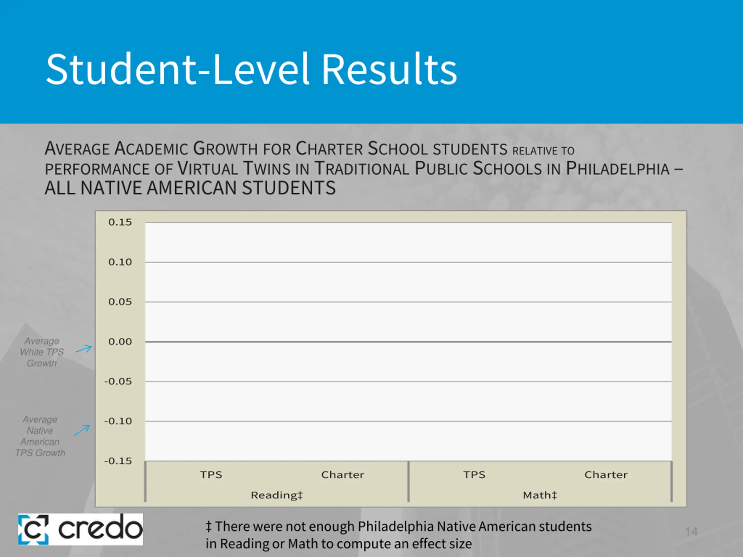 Student-Level Results AVERAGE ACADEMIC GROWTHFOR CHARTER SCHOOLSTUDENTSRELATIVETO PERFORMANCEOF VIRTUAL TWINSIN TRADITIONAL PUBLIC SCHOOLSIN PHILADELPHIA ALL ASIAN STUDENTS 0.25 0.20** 0.20 0.18** 0.17** 0.15 0.12** 0.10 0.05 0.15 Average White TPS Growth 0.10 0.00 0.05* 0.05 -0.05 Average Asian TPS Growth 0.00 -0.10 -0.02 -0.05 -0.15 -0.10 TPS Charter TPS Charter Reading Math -0.15 Reading Math 13