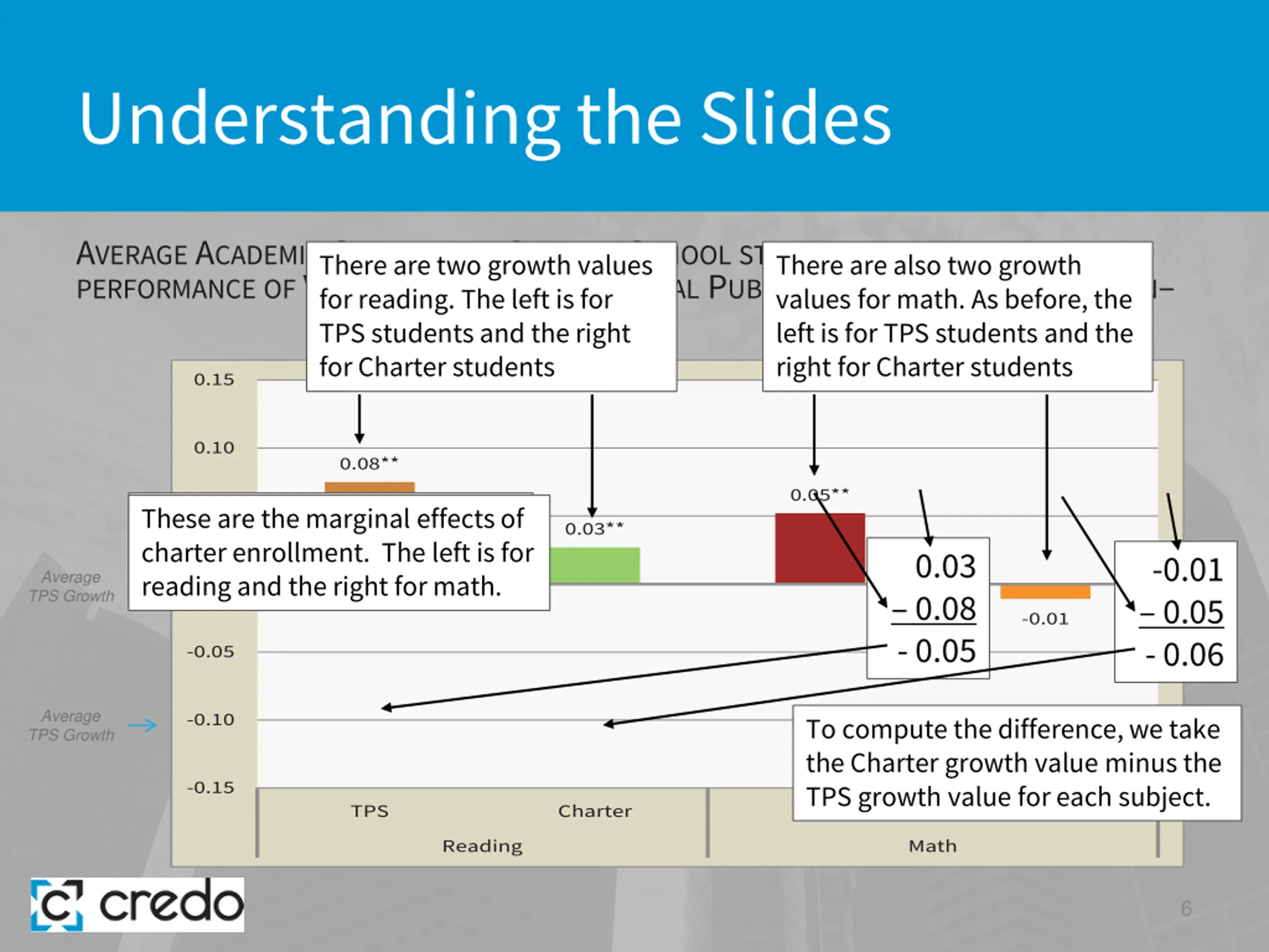 Understanding the Slides AVERAGE ACADEMIC GROWTHFOR CHARTER SCHOOLSTUDENTSRELATIVETO PERFORMANCEOF VIRTUAL TWINSIN TRADITIONAL PUBLIC SCHOOLSIN URBAN REGION for reading. The left is for TPS students and the right for Charter students There are two growth values There are also two growth values for math. As before, the left is for TPS students and the right for Charter students 0.15 0.10 0.08** 0.05** This graph looks at the difference between the charter and TPS growth values. reading and the right for math. These are the marginal effects of charter enrollment. The left is for 0.05 0.03** 0.03 0.08 - 0.05 -0.01 0.05 - 0.06 Average TPS Growth 0.00 0.15 -0.01 0.10 -0.05 0.05 Average TPS Growth 0.00 -0.10 To compute the difference, we take the Charter growth value minus the TPS growth value for each subject. -0.05 -0.15 -0.05** -0.06** -0.10 TPS Charter TPS Charter Reading Math -0.15 Reading Math 6