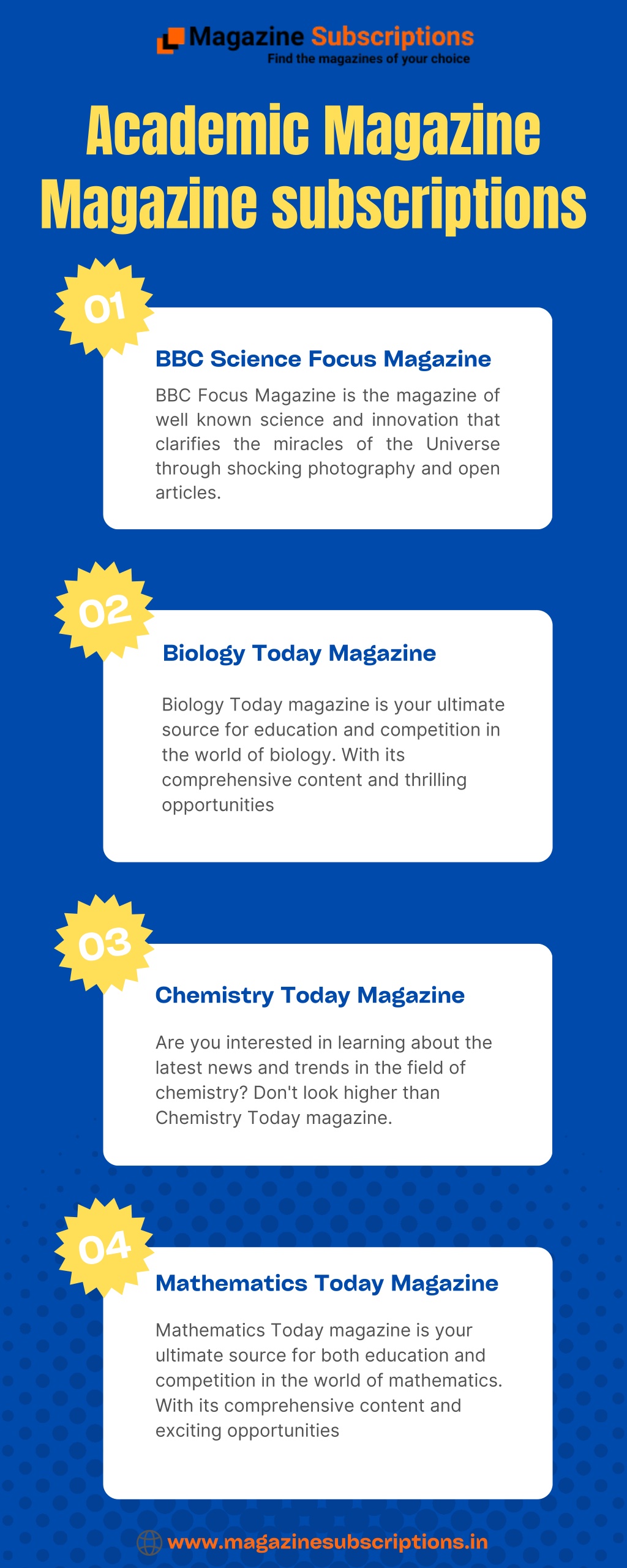 Academic Magazine Magazine subscriptions 01 BBC Science Focus Magazine BBC Focus Magazine is the magazine of well known science and innovation that clarifies the miracles of the Universe through shocking photography and open articles. 02 Biology Today Magazine Biology Today magazine is your ultimate source for education and competition in the world of biology. With its comprehensive content and thrilling opportunities 03 Chemistry Today Magazine Are you interested in learning about the latest news and trends in the field of chemistry? Don't look higher than Chemistry Today magazine. 04 Mathematics Today Magazine Mathematics Today magazine is your ultimate source for both education and competition in the world of mathematics. With its comprehensive content and exciting opportunities www.magazinesubscriptions.in