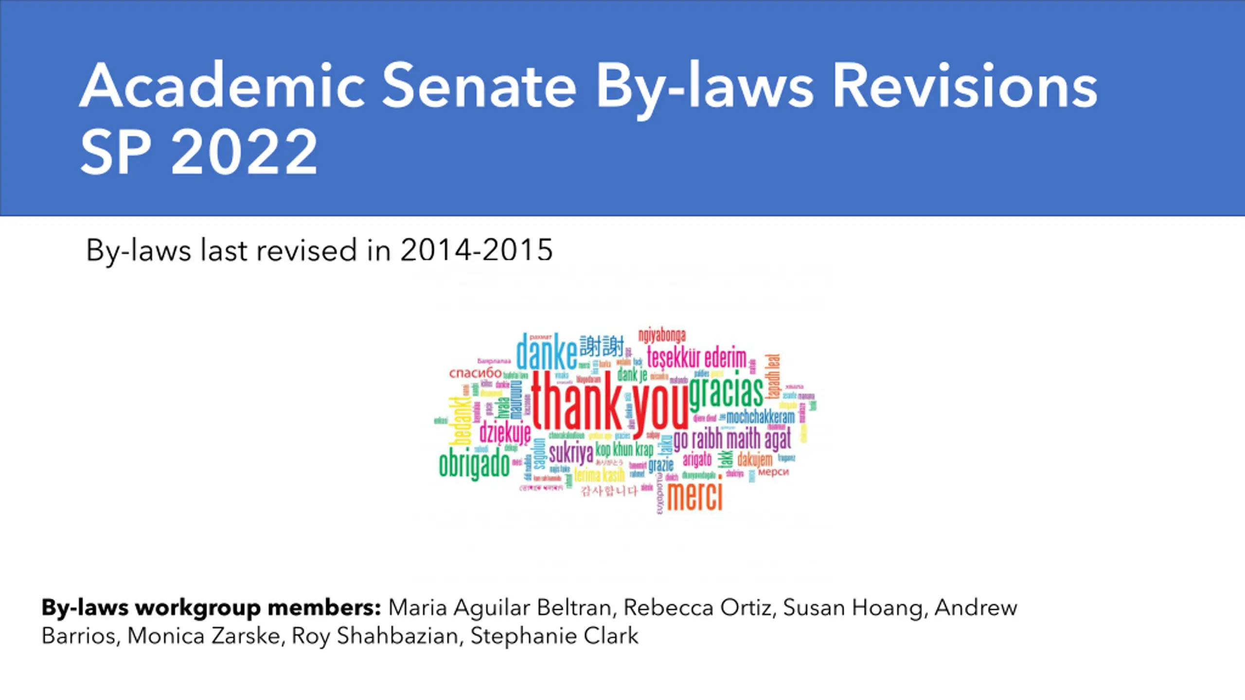 Academic Senate By-laws Revisions SP 2022 By-laws last revised in 2014-2015 By-laws workgroup members: Maria Aguilar Beltran, Rebecca Ortiz, Susan Hoang, Andrew Barrios, Monica Zarske, Roy Shahbazian, Stephanie Clark