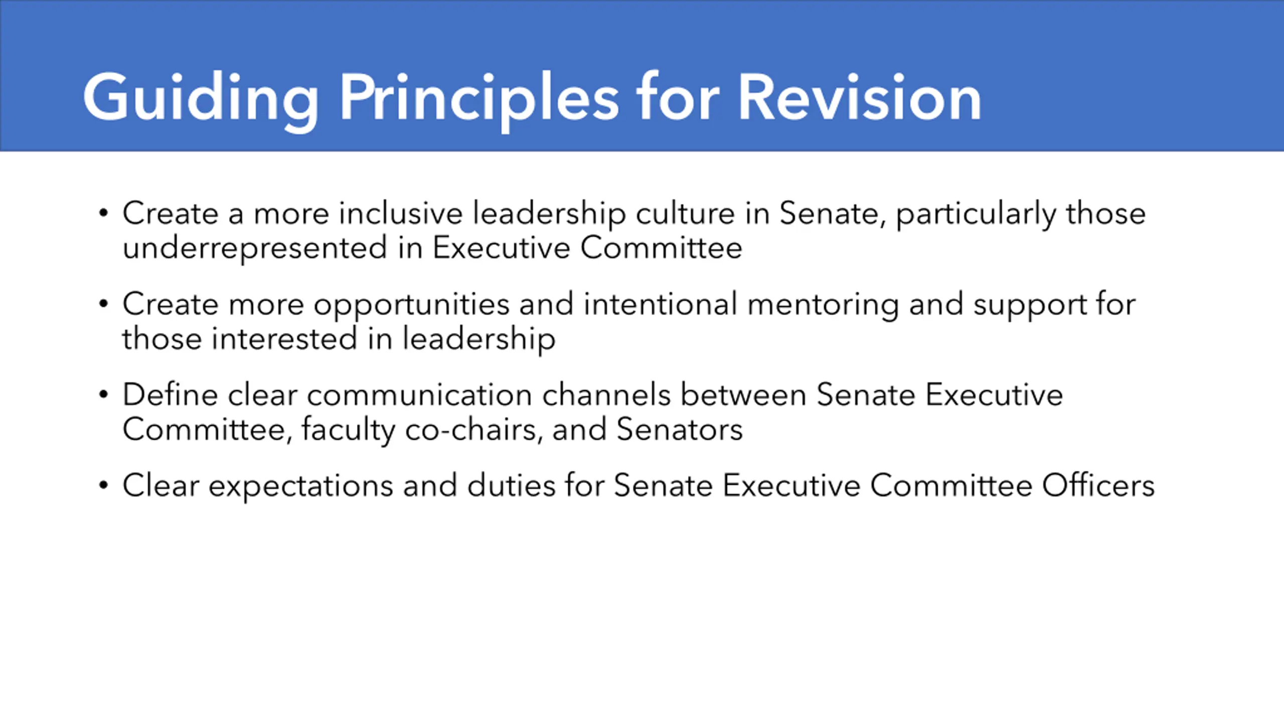 Guiding Principles for Revision Create a more inclusive leadership culture in Senate, particularly those underrepresented in Executive Committee Create more opportunities and intentional mentoring and support for those interested in leadership Define clear communication channels between Senate Executive Committee, faculty co-chairs, and Senators Clear expectations and duties for Senate Executive Committee Officers