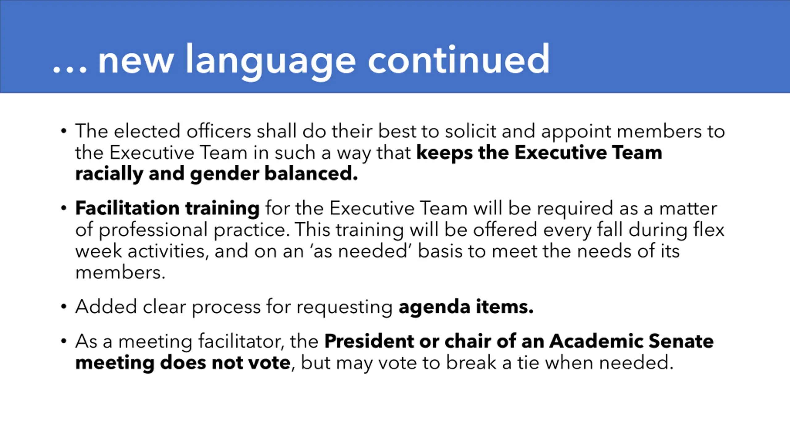 new language continued The elected officers shall do their best to solicit and appoint members to the Executive Team in such a way that keeps the Executive Team racially and gender balanced. Facilitation training for the Executive Team will be required as a matter of professional practice. This training will be offered every fall during flex week activities, and on an as needed basis to meet the needs of its members. Added clear process for requesting agenda items. As a meeting facilitator, the President or chair of an Academic Senate meeting does not vote, but may vote to break a tie when needed.