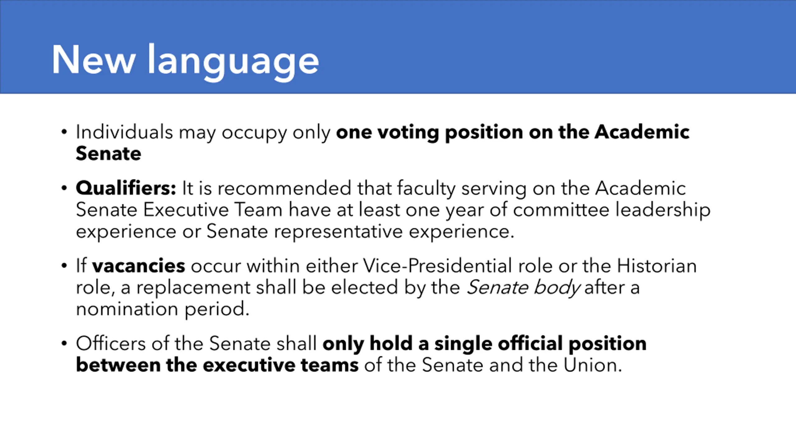 New language Individuals may occupy only one voting position on the Academic Senate Qualifiers: It is recommended that faculty serving on the Academic Senate Executive Team have at least one year of committee leadership experience or Senate representative experience. If vacancies occur within either Vice-Presidential role or the Historian role, a replacement shall be elected by the Senate body after a nomination period. Officers of the Senate shall only hold a single official position between the executive teams of the Senate and the Union.
