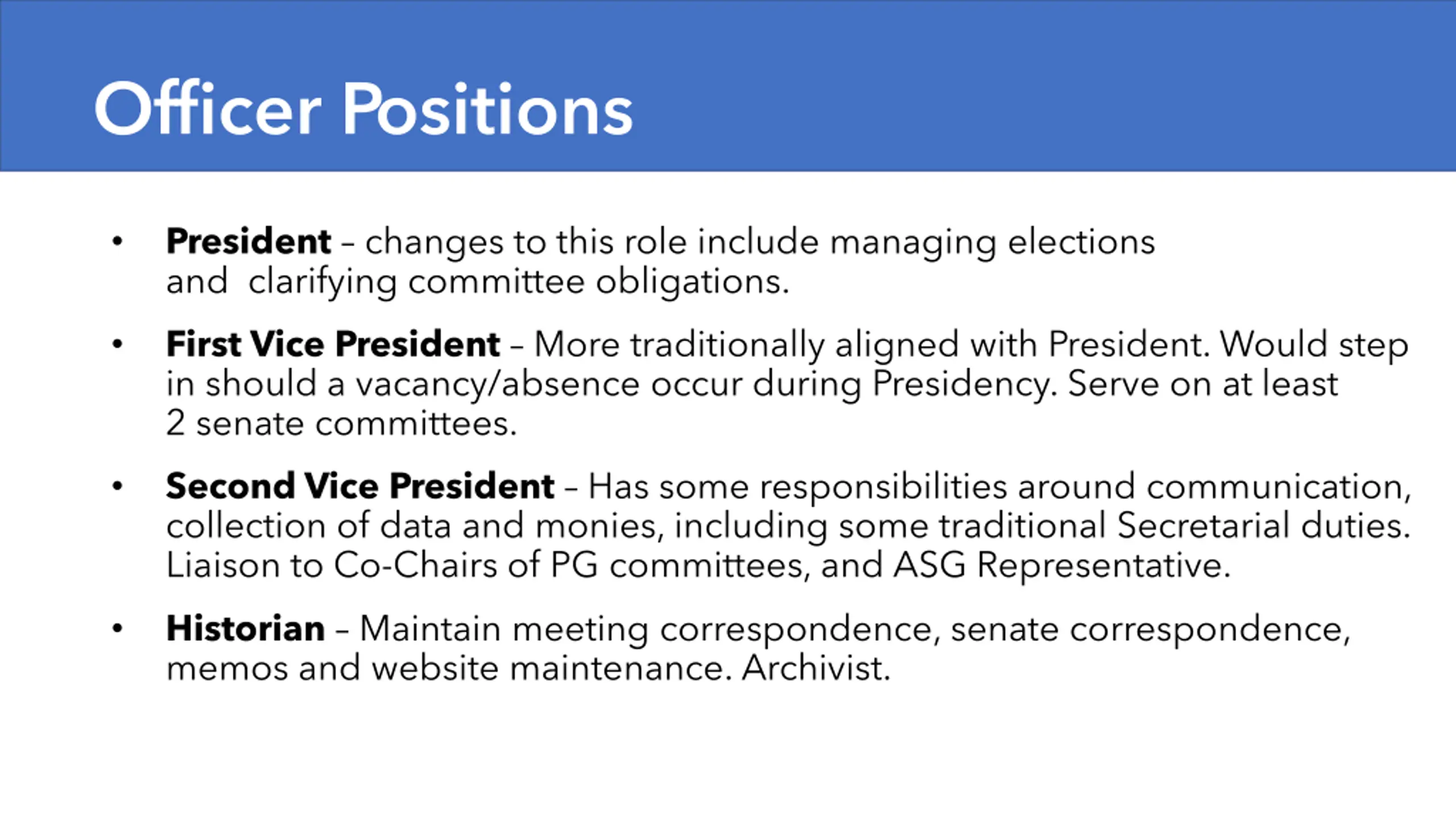 Officer Positions President changes to this role include managing elections and clarifying committee obligations. First Vice President More traditionally aligned with President. Would step in should a vacancy/absence occur during Presidency. Serve on at least 2 senate committees. Second Vice President Has some responsibilities around communication, collection of data and monies, including some traditional Secretarial duties. Liaison to Co-Chairs of PG committees, and ASG Representative. Historian Maintain meeting correspondence, senate correspondence, memos and website maintenance. Archivist.