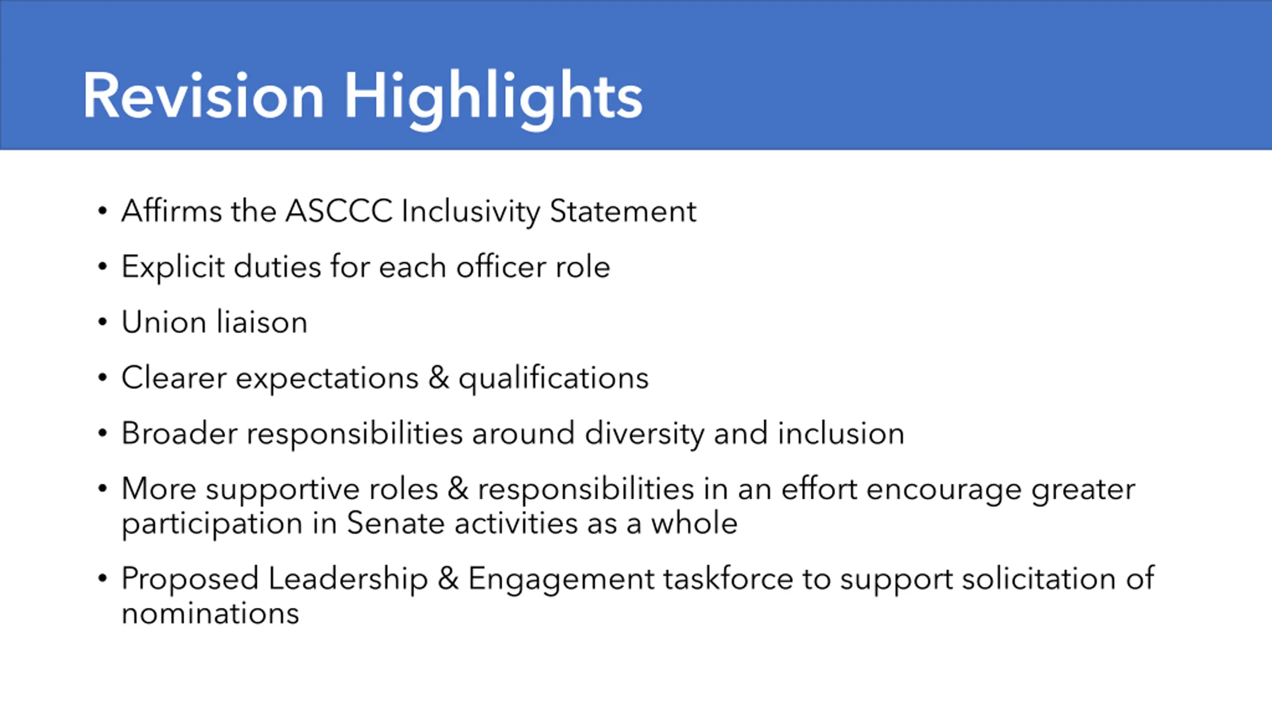 Revision Highlights Affirms the ASCCC Inclusivity Statement Explicit duties for each officer role Union liaison Clearer expectations & qualifications Broader responsibilities around diversity and inclusion More supportive roles & responsibilities in an effort encourage greater participation in Senate activities as a whole Proposed Leadership & Engagement taskforce to support solicitation of nominations