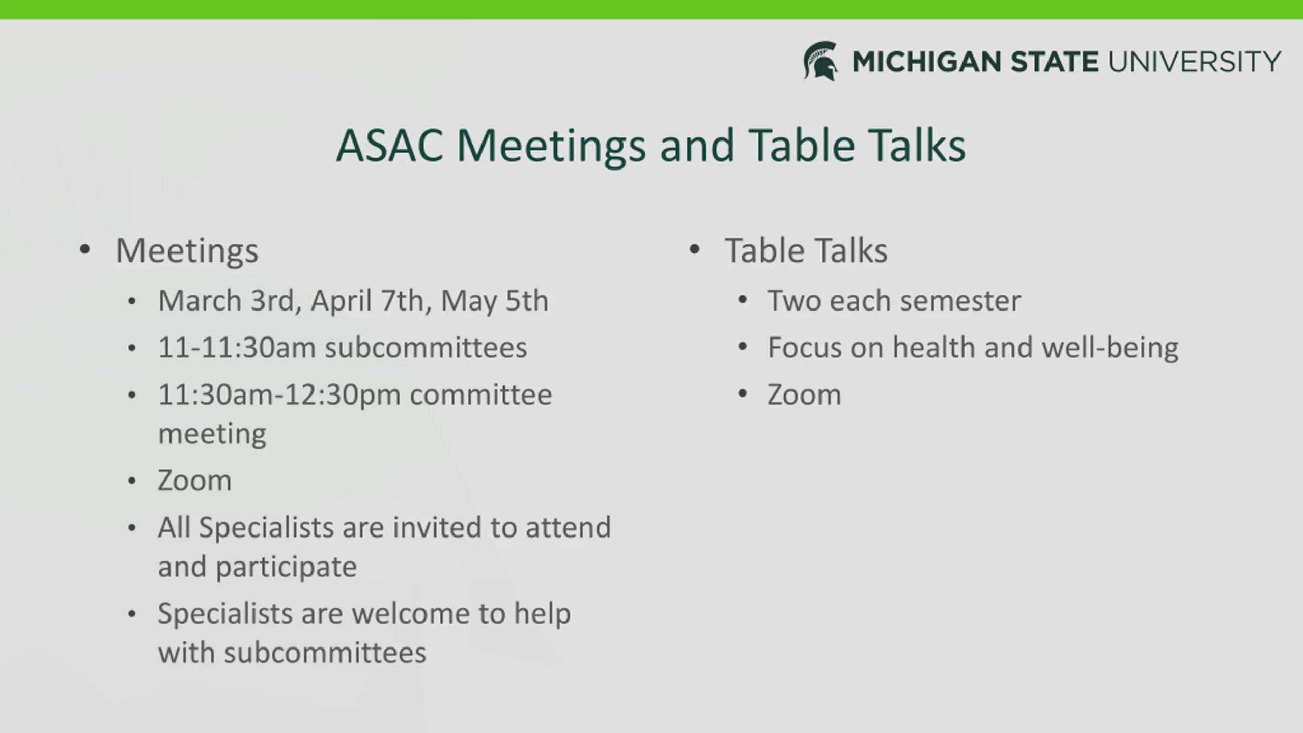 ASAC Meetings and Table Talks Meetings March 3rd, April 7th, May 5th 11-11:30am subcommittees 11:30am-12:30pm committee meeting Zoom All Specialists are invited to attend and participate Specialists are welcome to help with subcommittees Table Talks Two each semester Focus on health and well-being Zoom