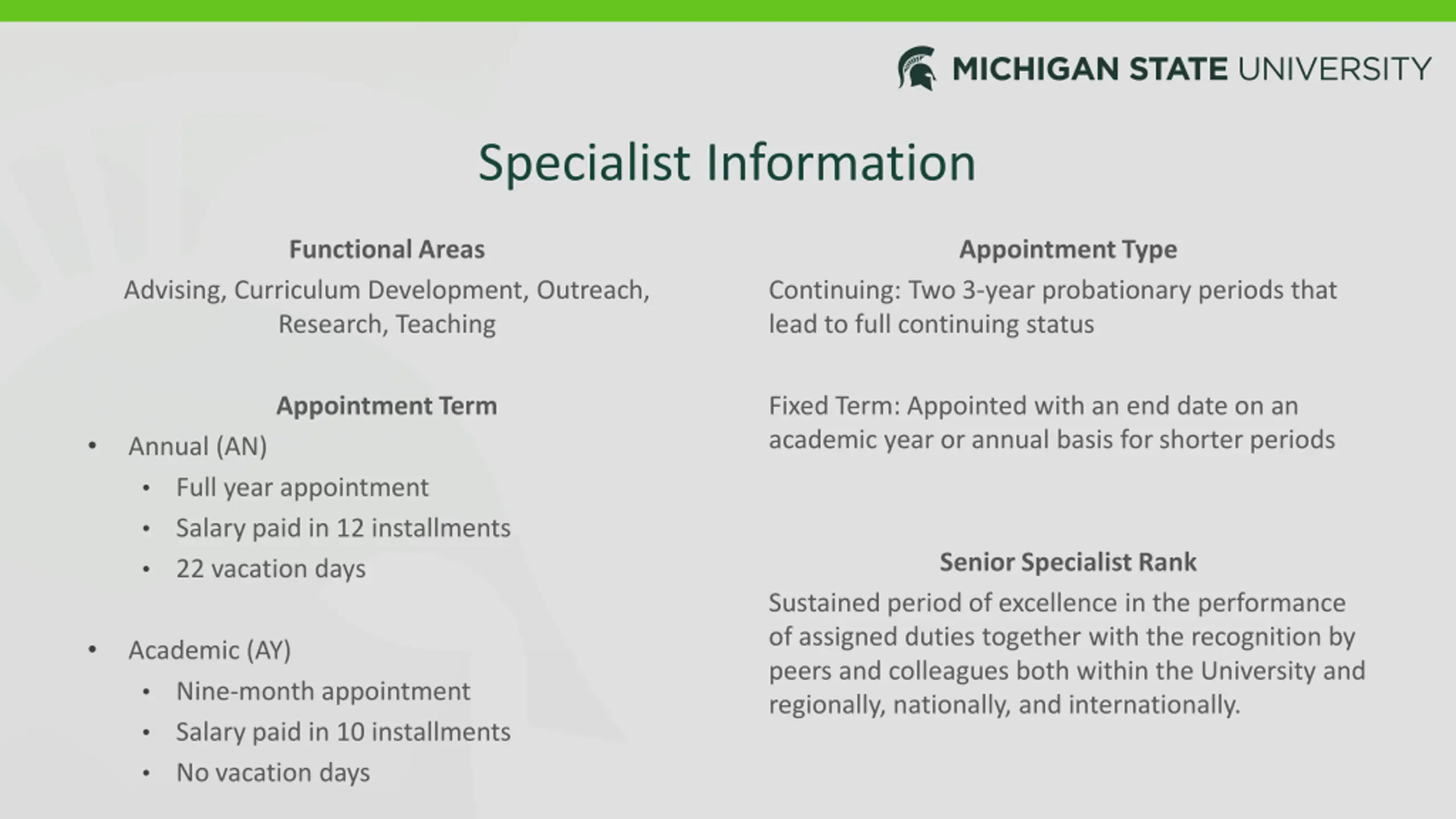 Specialist Information Functional Areas Appointment Type Advising, Curriculum Development, Outreach, Research, Teaching Continuing: Two 3-year probationary periods that lead to full continuing status Appointment Term Fixed Term: Appointed with an end date on an academic year or annual basis for shorter periods Annual (AN) Full year appointment Salary paid in 12 installments 22 vacation days Senior Specialist Rank Sustained period of excellence in the performance of assigned duties together with the recognition by peers and colleagues both within the University and regionally, nationally, and internationally. Academic (AY) Nine-month appointment Salary paid in 10 installments No vacation days