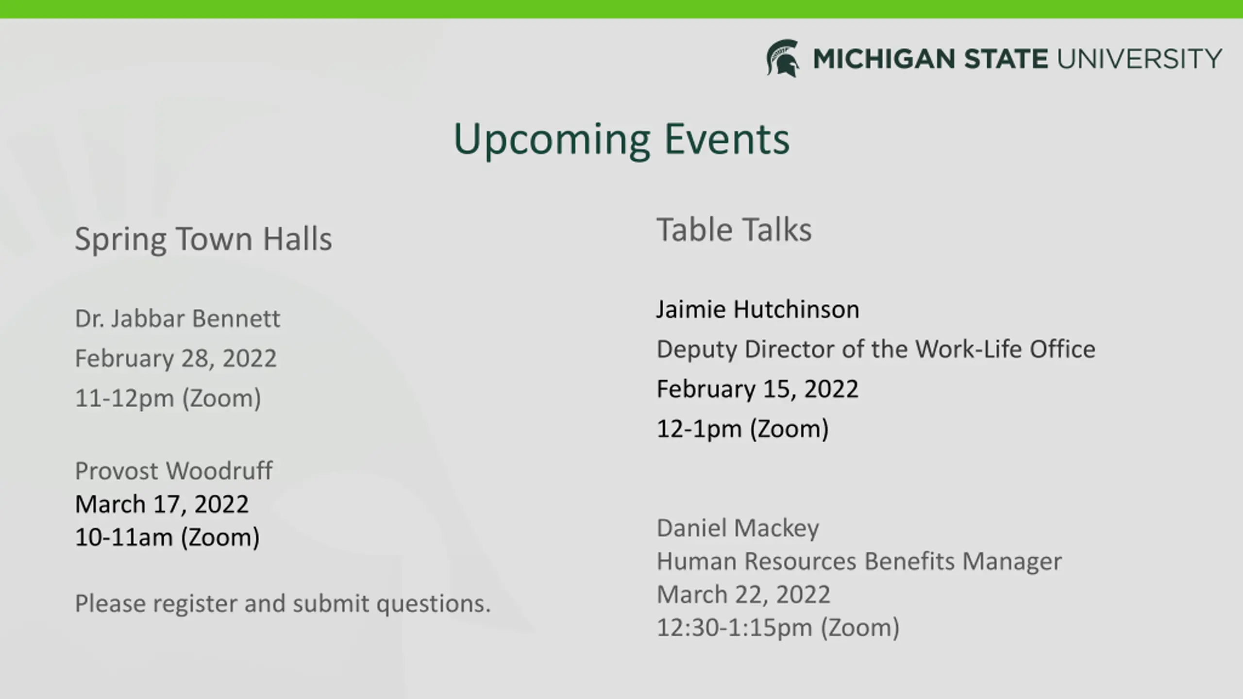 Upcoming Events Table Talks Spring Town Halls Jaimie Hutchinson Deputy Director of the Work-Life Office February 15, 2022 12-1pm (Zoom) Dr. Jabbar Bennett February 28, 2022 11-12pm (Zoom) Provost Woodruff March 17, 2022 10-11am (Zoom) Daniel Mackey Human Resources Benefits Manager March 22, 2022 12:30-1:15pm (Zoom) Please register and submit questions.