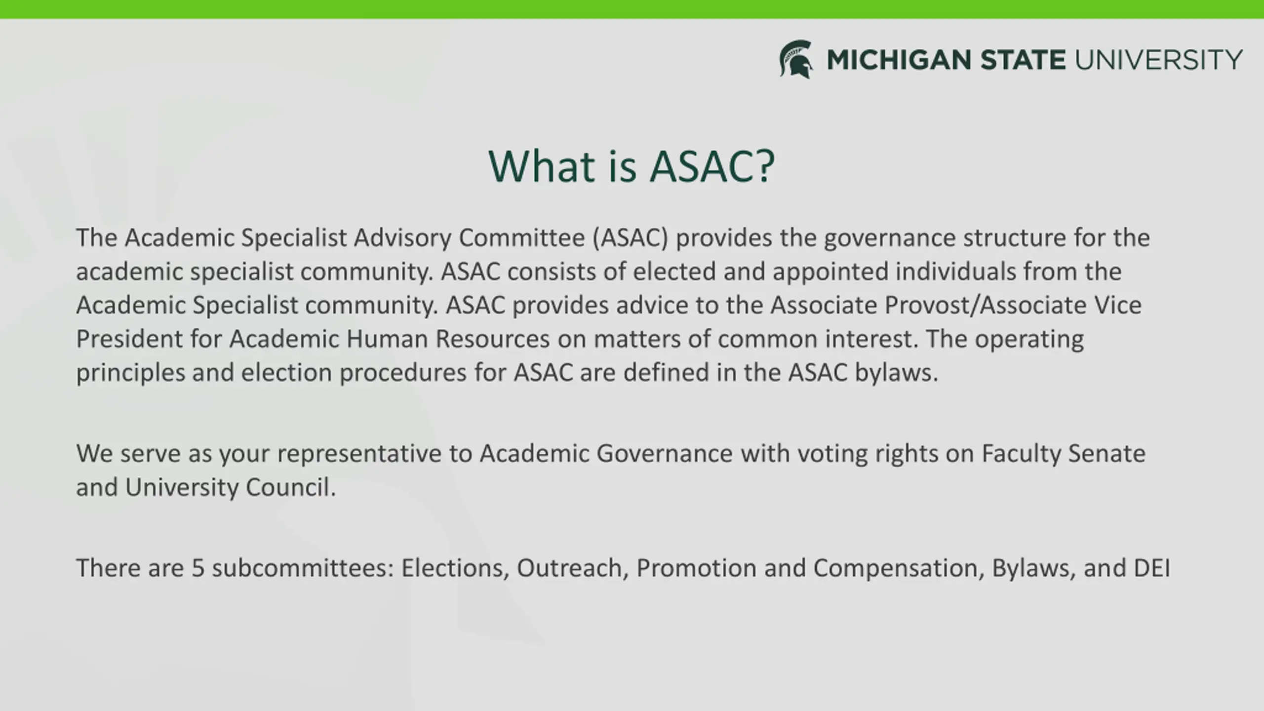 What is ASAC? The Academic Specialist Advisory Committee (ASAC) provides the governance structure for the academic specialist community. ASAC consists of elected and appointed individuals from the Academic Specialist community. ASAC provides advice to the Associate Provost/Associate Vice President for Academic Human Resources on matters of common interest. The operating principles and election procedures for ASAC are defined in the ASAC bylaws. We serve as your representative to Academic Governance with voting rights on Faculty Senate and University Council. There are 5 subcommittees: Elections, Outreach, Promotion and Compensation, Bylaws, and DEI