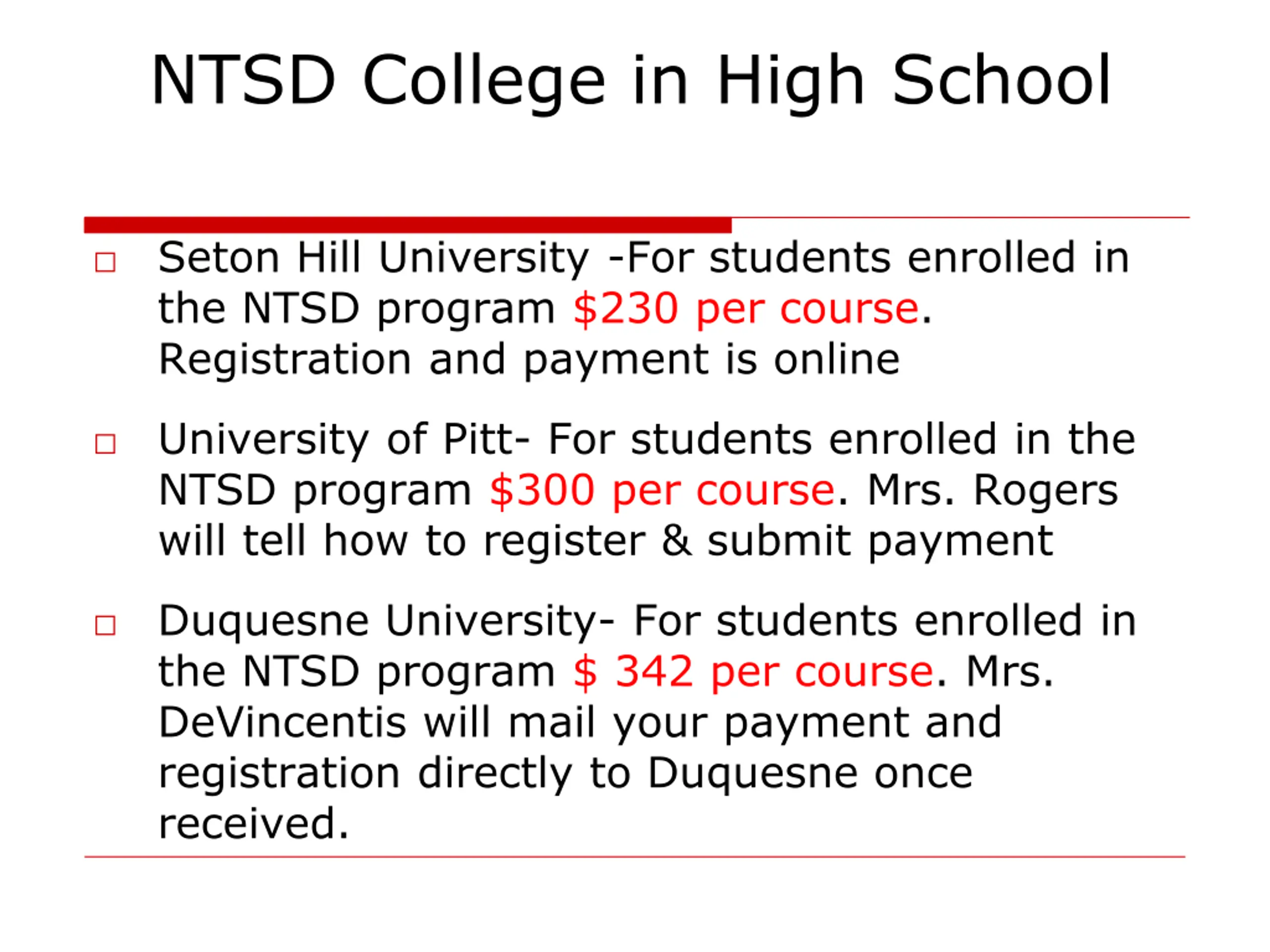 NTSD College in High School Seton Hill University -For students enrolled in the NTSD program $230 per course. Registration and payment is online University of Pitt- For students enrolled in the NTSD program $300 per course. Mrs. Rogers will tell how to register & submit payment Duquesne University- For students enrolled in the NTSD program $ 342 per course. Mrs. DeVincentis will mail your payment and registration directly to Duquesne once received.