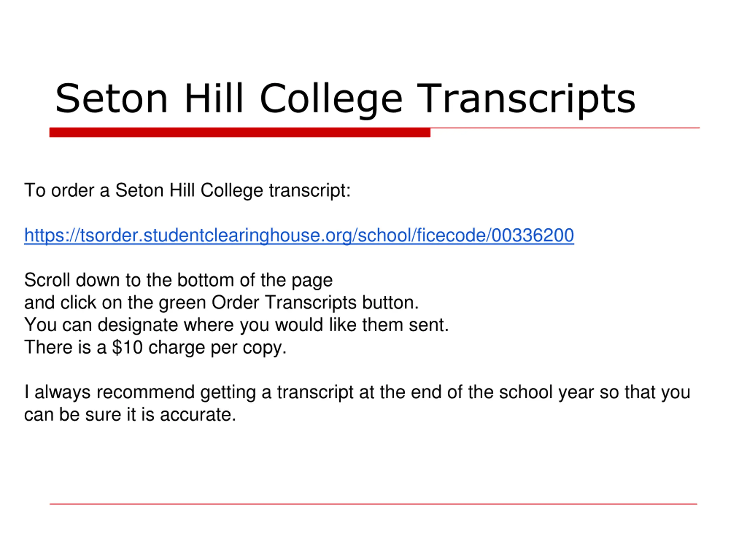 Seton Hill College Transcripts To order a Seton Hill College transcript: https://tsorder.studentclearinghouse.org/school/ficecode/00336200 Scroll down to the bottom of the page and click on the green Order Transcripts button. You can designate where you would like them sent. There is a $10 charge per copy. I always recommend getting a transcript at the end of the school year so that you can be sure it is accurate.
