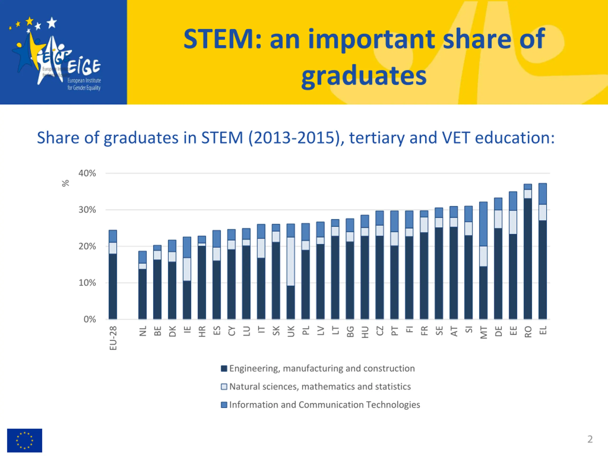 STEM: an important share of graduates Share of graduates in STEM (2013-2015), tertiary and VET education: 40% % 30% 20% 10% 0% DE NL MT DK PL ES PT LT SE EE LU LV FI FR AT SI EL SK HR IT UK BE IE CZ RO EU-28 CY HU BG Engineering, manufacturing and construction Natural sciences, mathematics and statistics Information and Communication Technologies