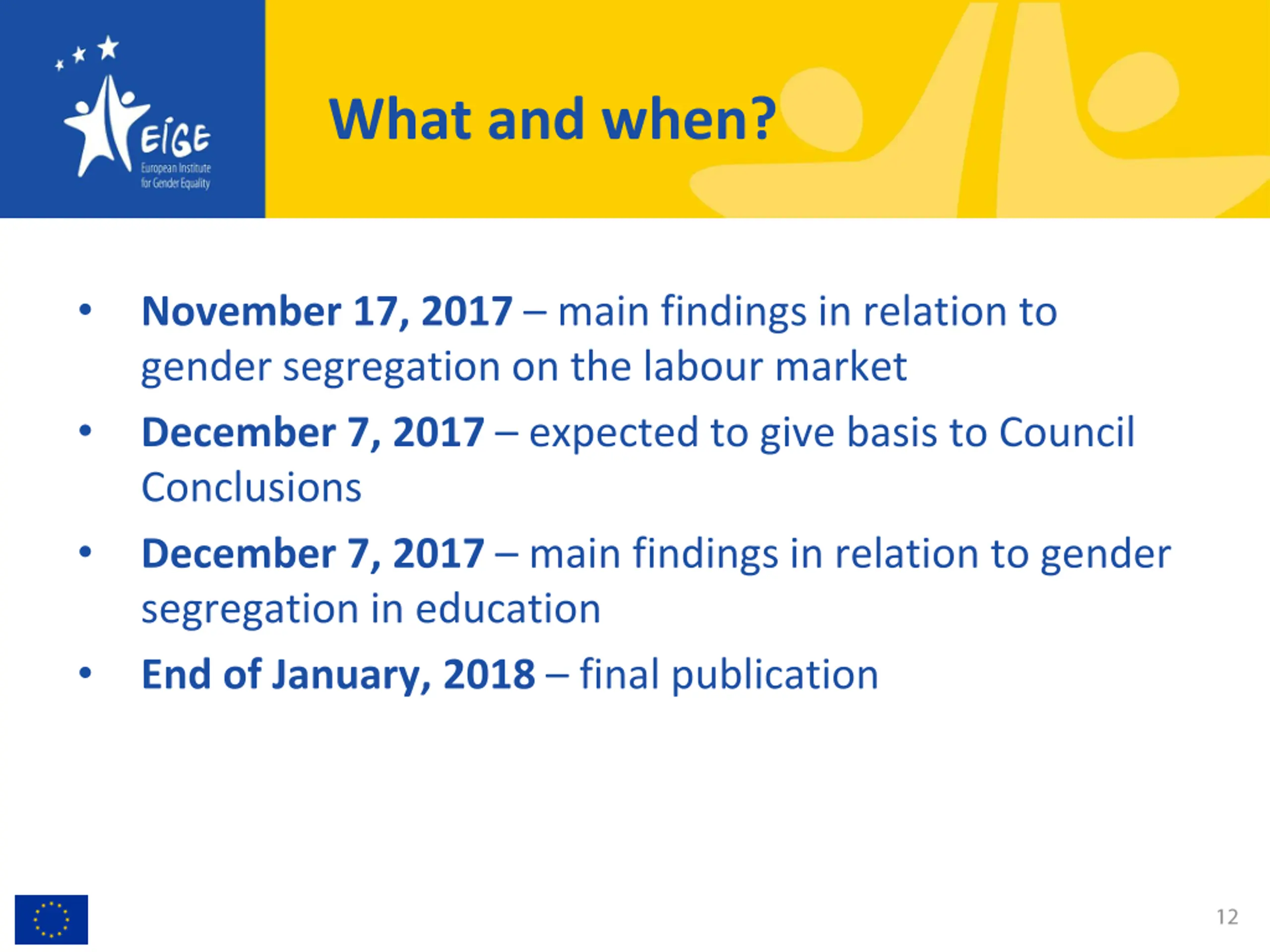 What and when? November 17, 2017 main findings in relation to gender segregation on the labour market December 7, 2017 expected to give basis to Council Conclusions December 7, 2017 main findings in relation to gender segregation in education End of January, 2018 final publication