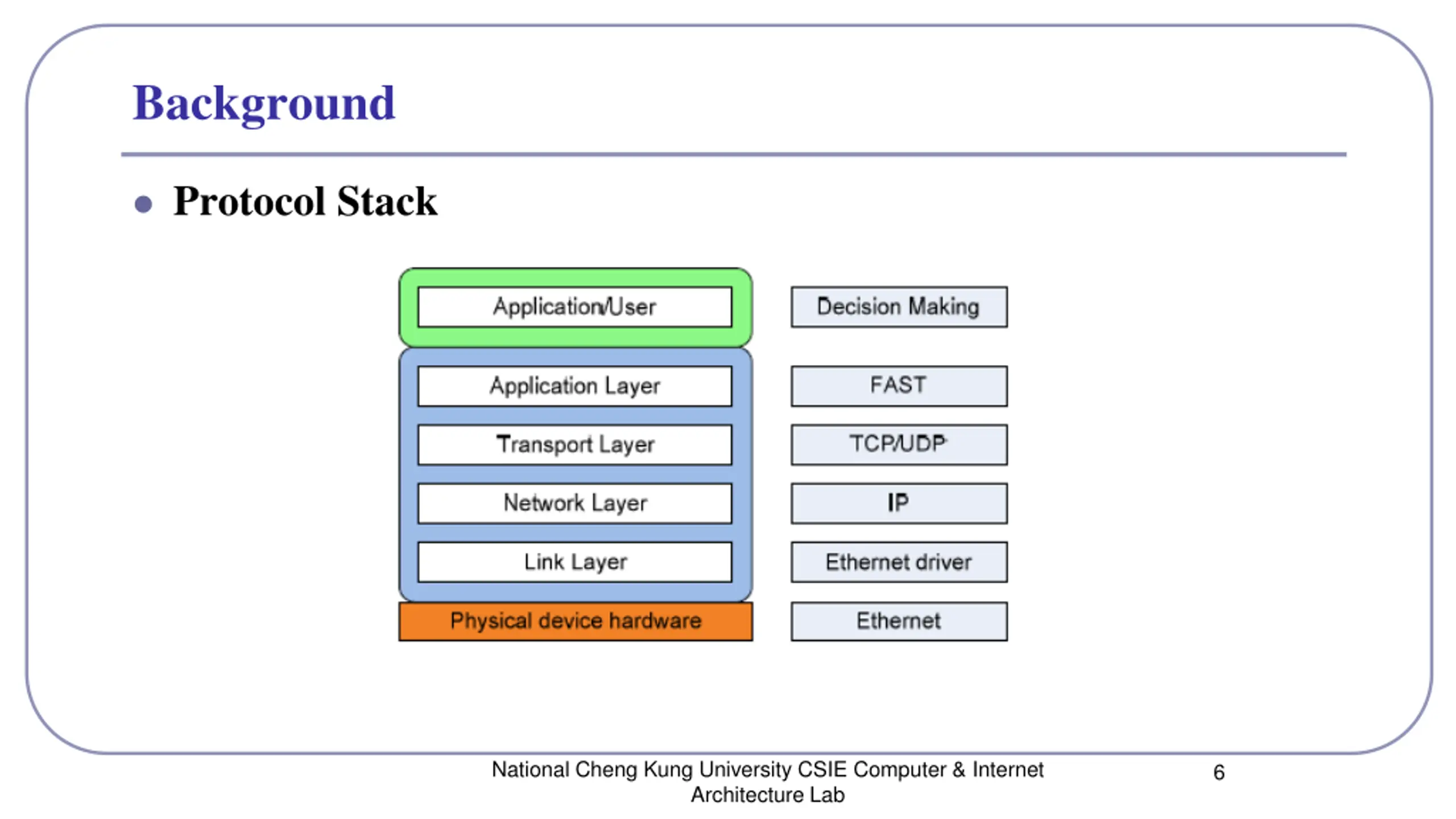 Background Protocol Stack National Cheng Kung University CSIE Computer & Internet Architecture Lab 6