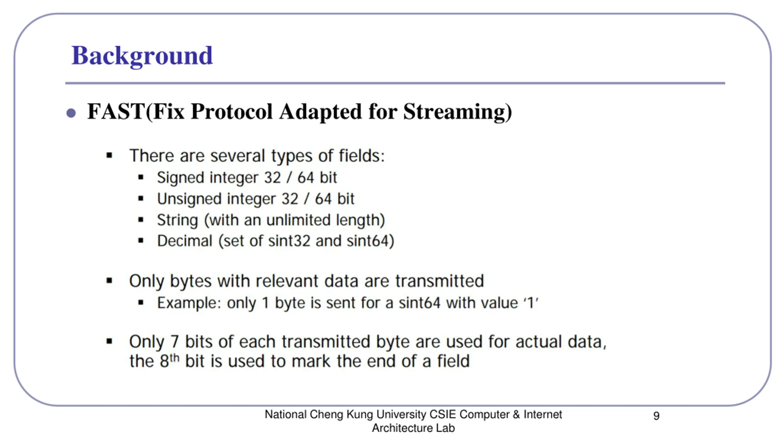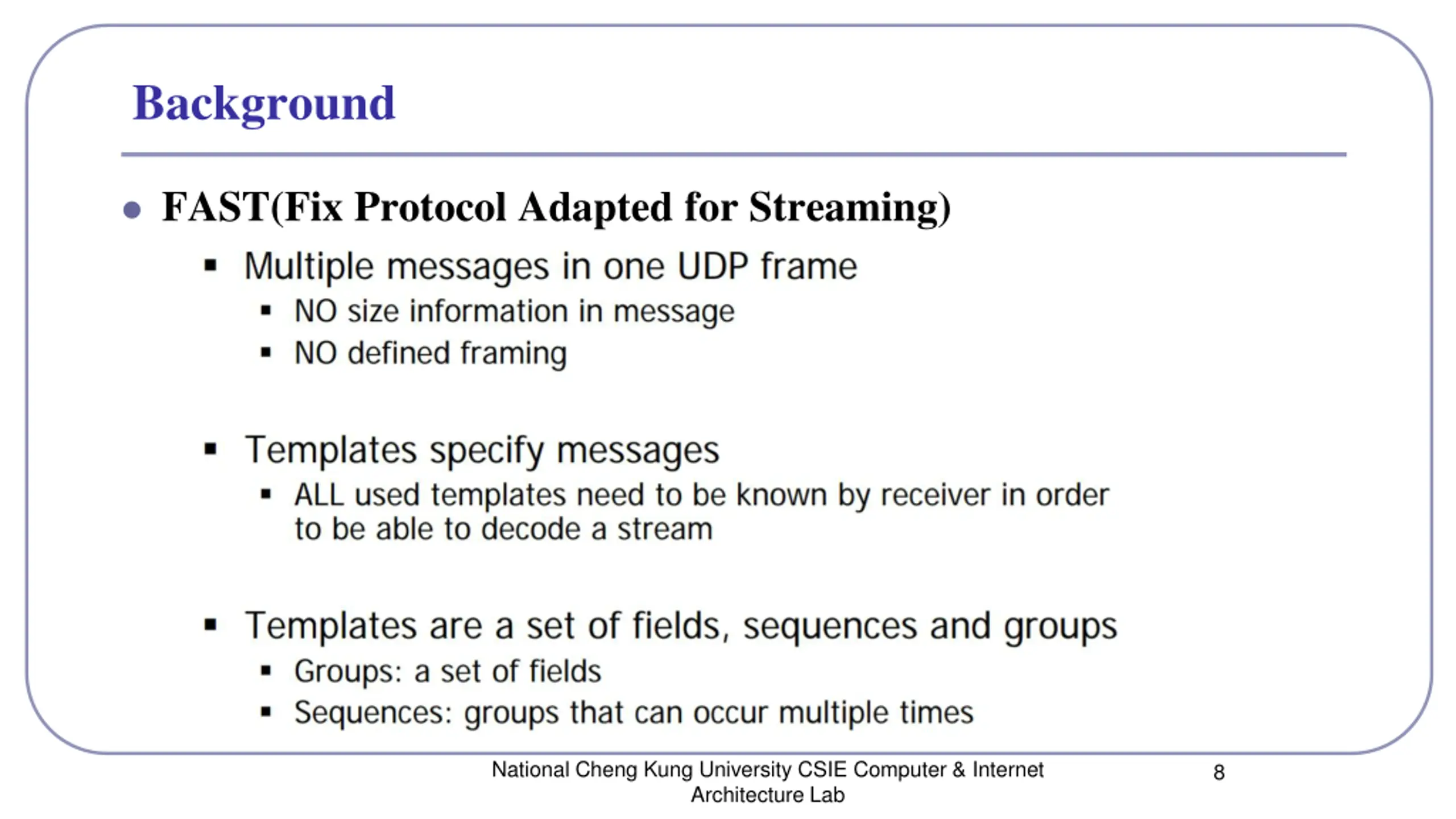 Background FAST(Fix Protocol Adapted for Streaming) National Cheng Kung University CSIE Computer & Internet Architecture Lab 8