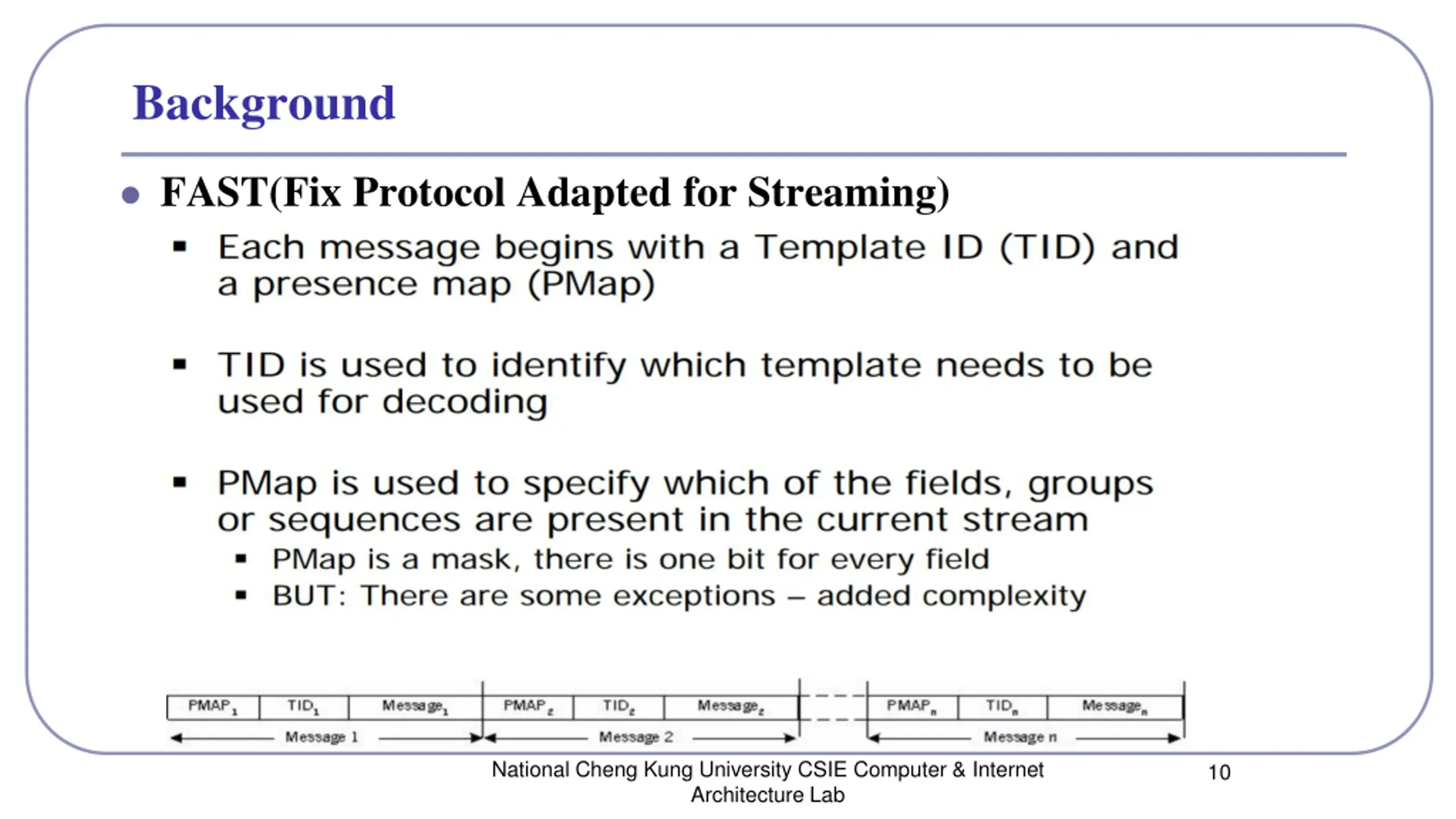 Background FAST(Fix Protocol Adapted for Streaming) National Cheng Kung University CSIE Computer & Internet Architecture Lab 10