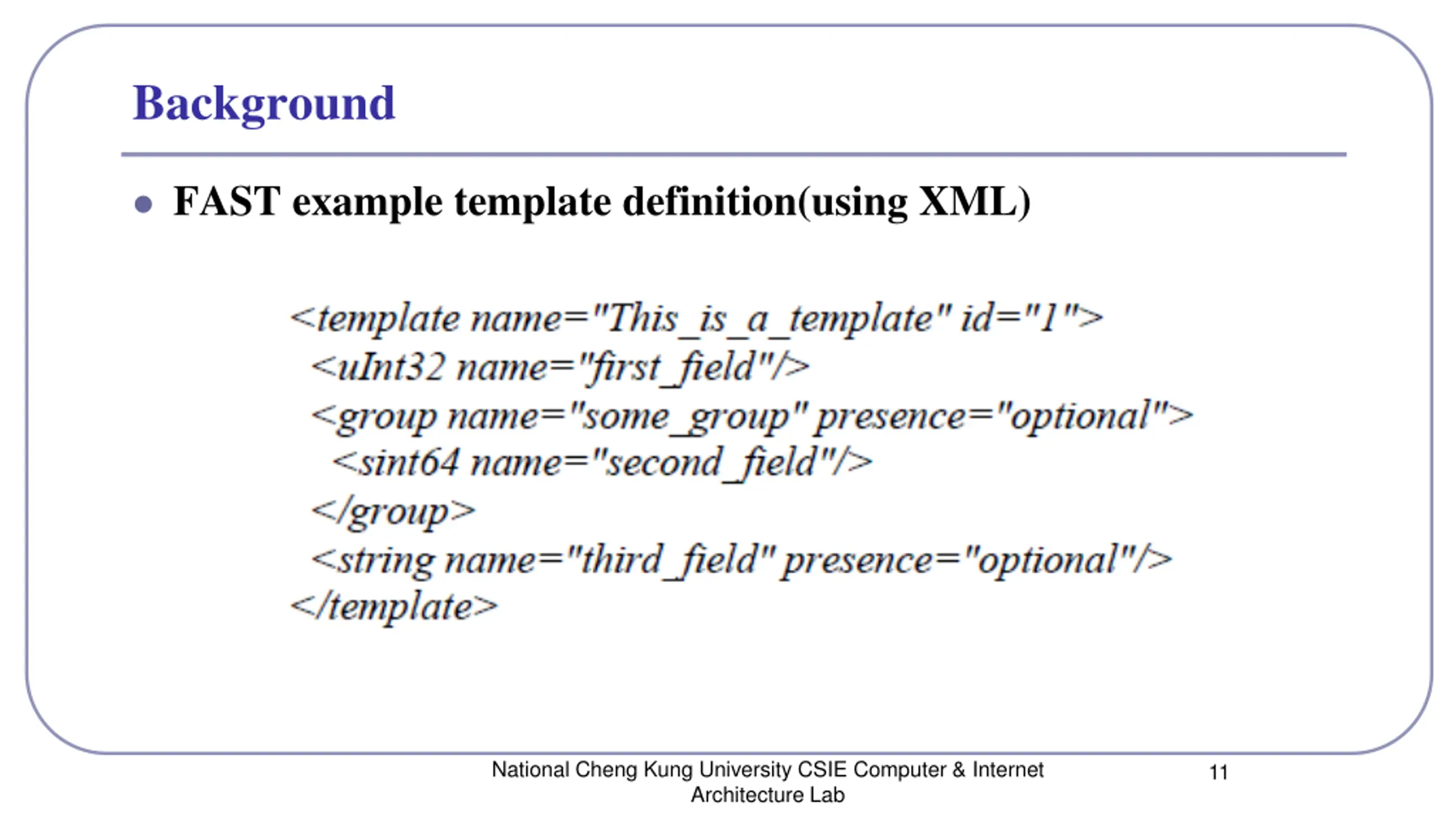 Background FAST example template definition(using XML) National Cheng Kung University CSIE Computer & Internet Architecture Lab 11