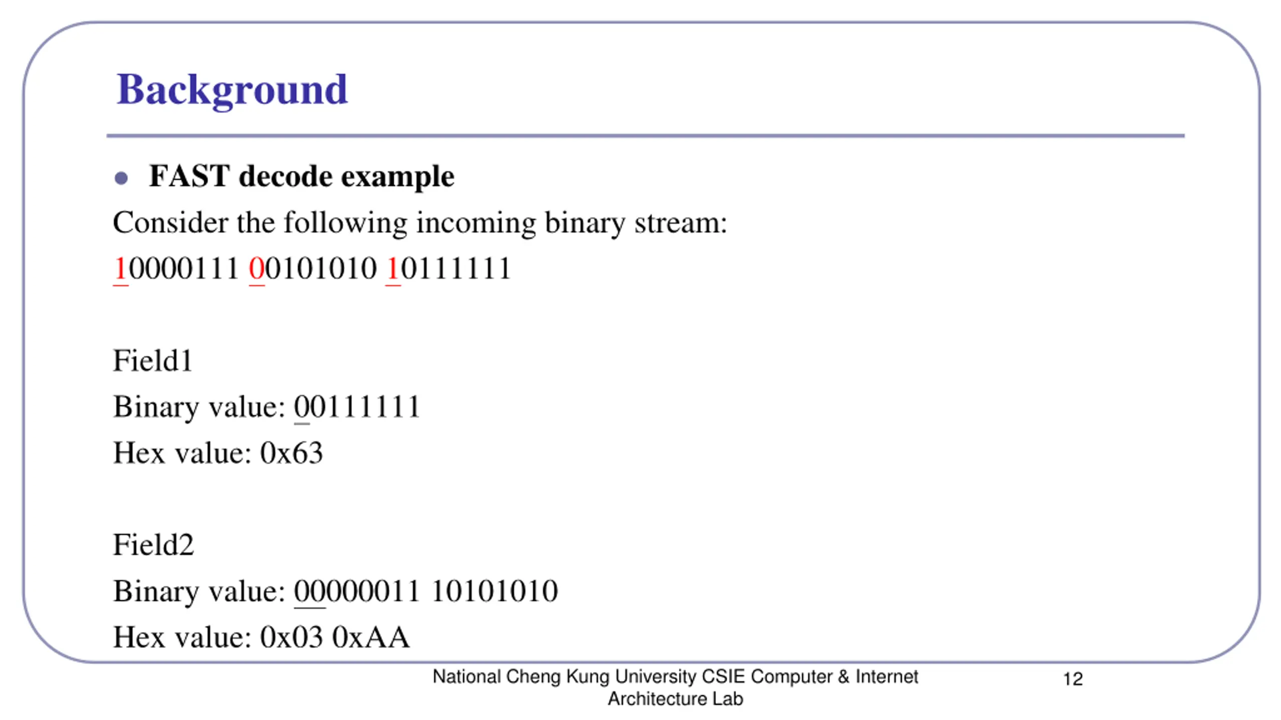 Background FAST decode example Consider the following incoming binary stream: 10000111 00101010 10111111 Field1 Binary value: 00111111 Hex value: 0x63 Field2 Binary value: 00000011 10101010 Hex value: 0x03 0xAA National Cheng Kung University CSIE Computer & Internet Architecture Lab 12