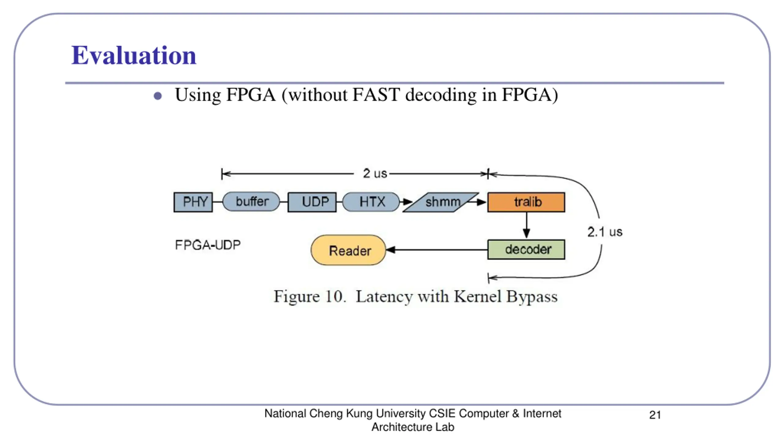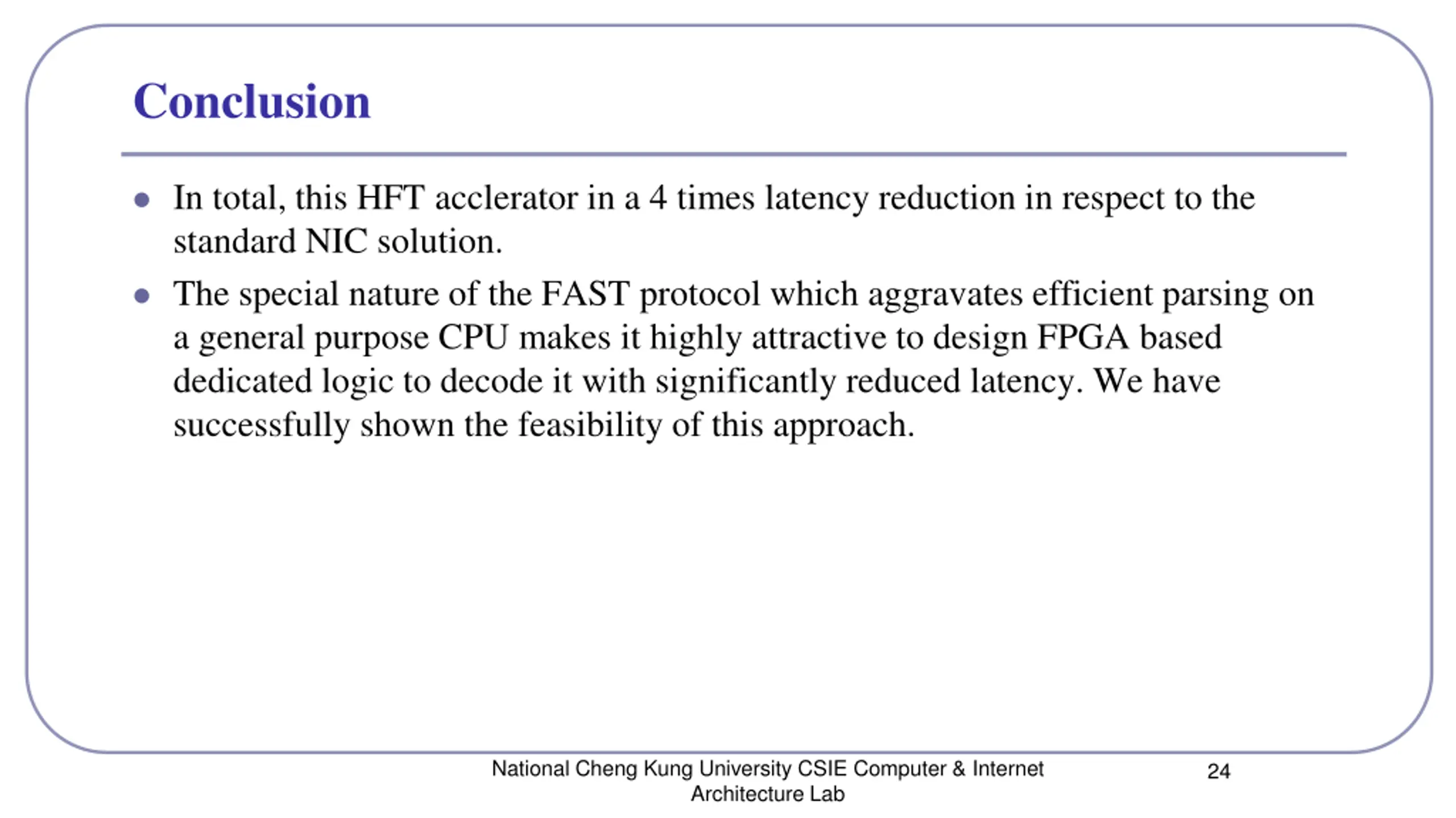 Conclusion In total, this HFT acclerator in a 4 times latency reduction in respect to the standard NIC solution. The special nature of the FAST protocol which aggravates efficient parsing on a general purpose CPU makes it highly attractive to design FPGA based dedicated logic to decode it with significantly reduced latency. We have successfully shown the feasibility of this approach. National Cheng Kung University CSIE Computer & Internet Architecture Lab 24
