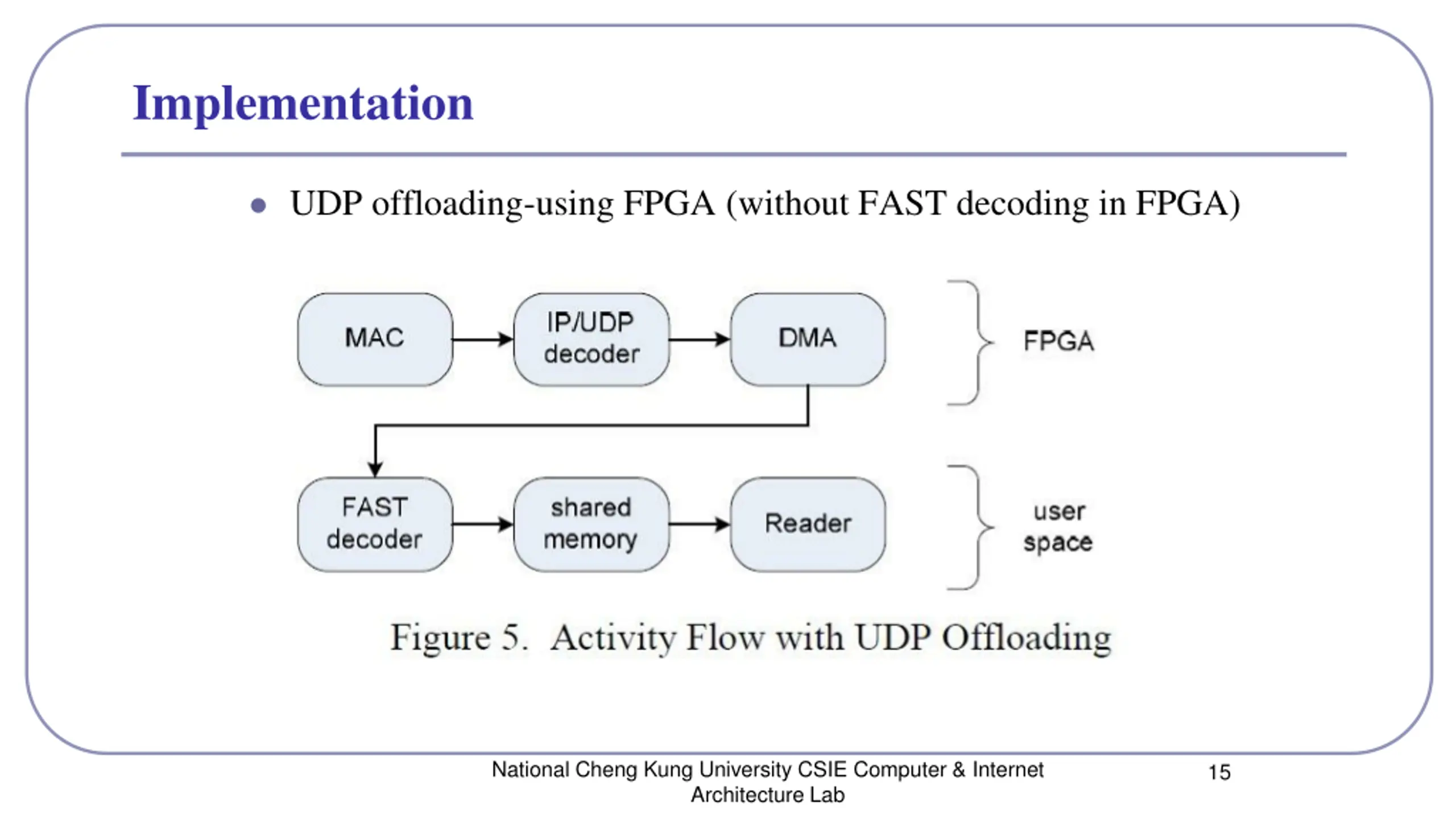 Implementation UDP offloading-using FPGA (without FAST decoding in FPGA) National Cheng Kung University CSIE Computer & Internet Architecture Lab 15