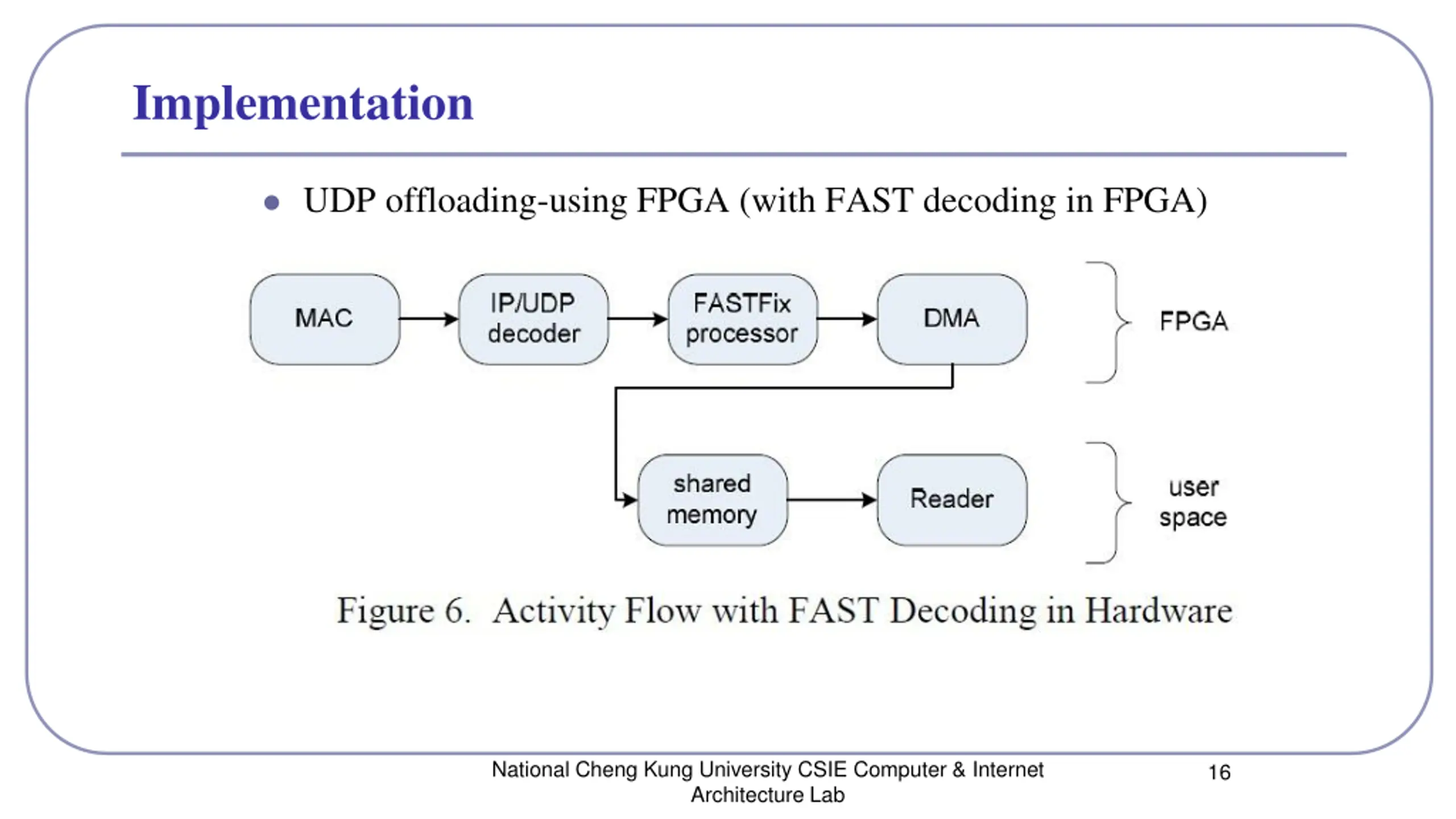 Implementation UDP offloading-using FPGA (with FAST decoding in FPGA) National Cheng Kung University CSIE Computer & Internet Architecture Lab 16