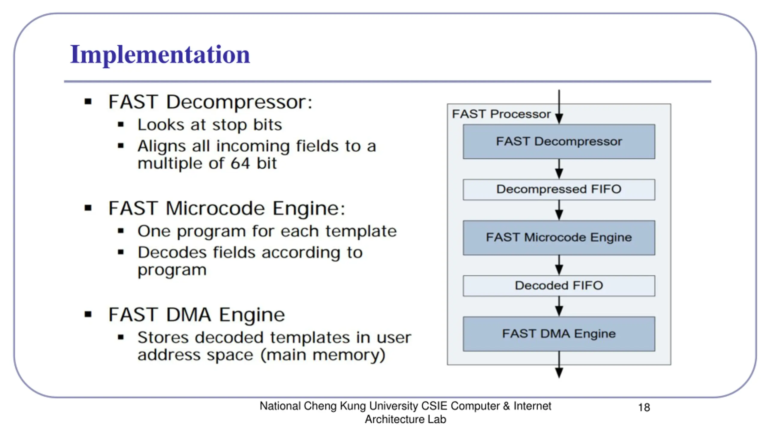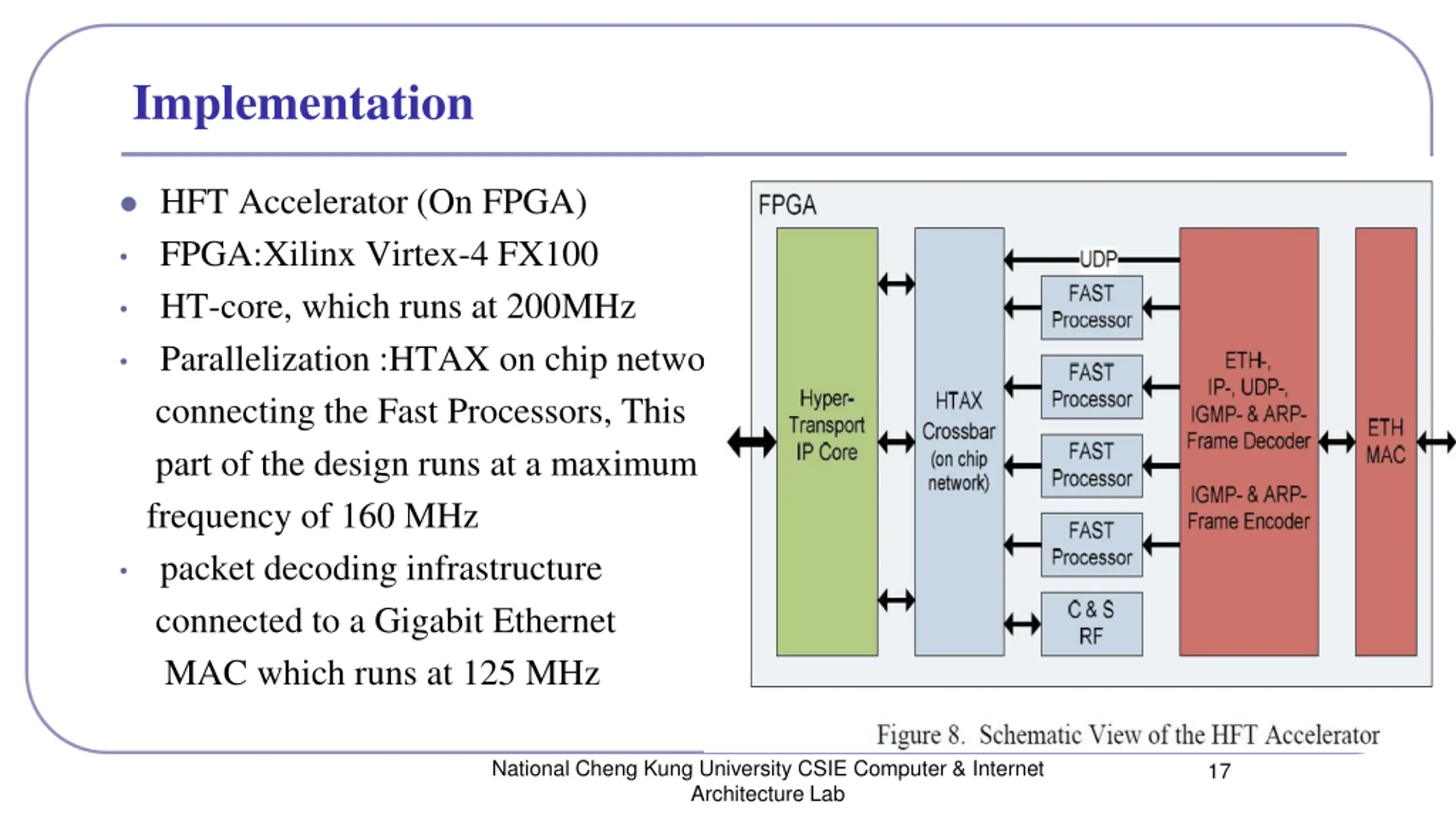 Implementation HFT Accelerator (On FPGA) FPGA:Xilinx Virtex-4 FX100 HT-core, which runs at 200MHz Parallelization :HTAX on chip network connecting the Fast Processors, This part of the design runs at a maximum frequency of 160 MHz packet decoding infrastructure connected to a Gigabit Ethernet MAC which runs at 125 MHz National Cheng Kung University CSIE Computer & Internet Architecture Lab 17